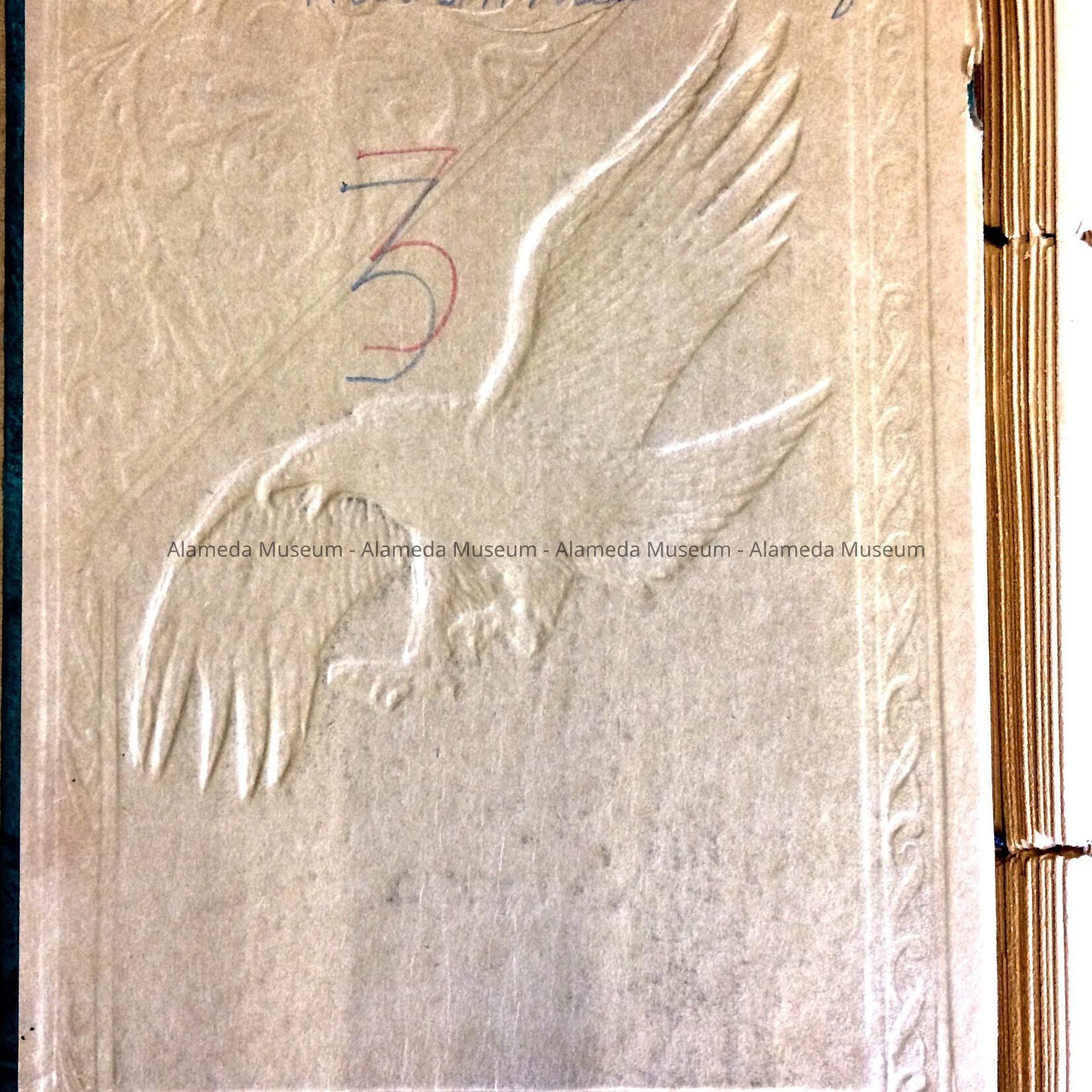 Description: Loose leaf scrap book with green embossed cover with an imprint of an eagle. The contents are war cartoons, These were taken from the Alameda Times Star, Alameda, Califomia, from December 8, 1942 to December 7, 1943.