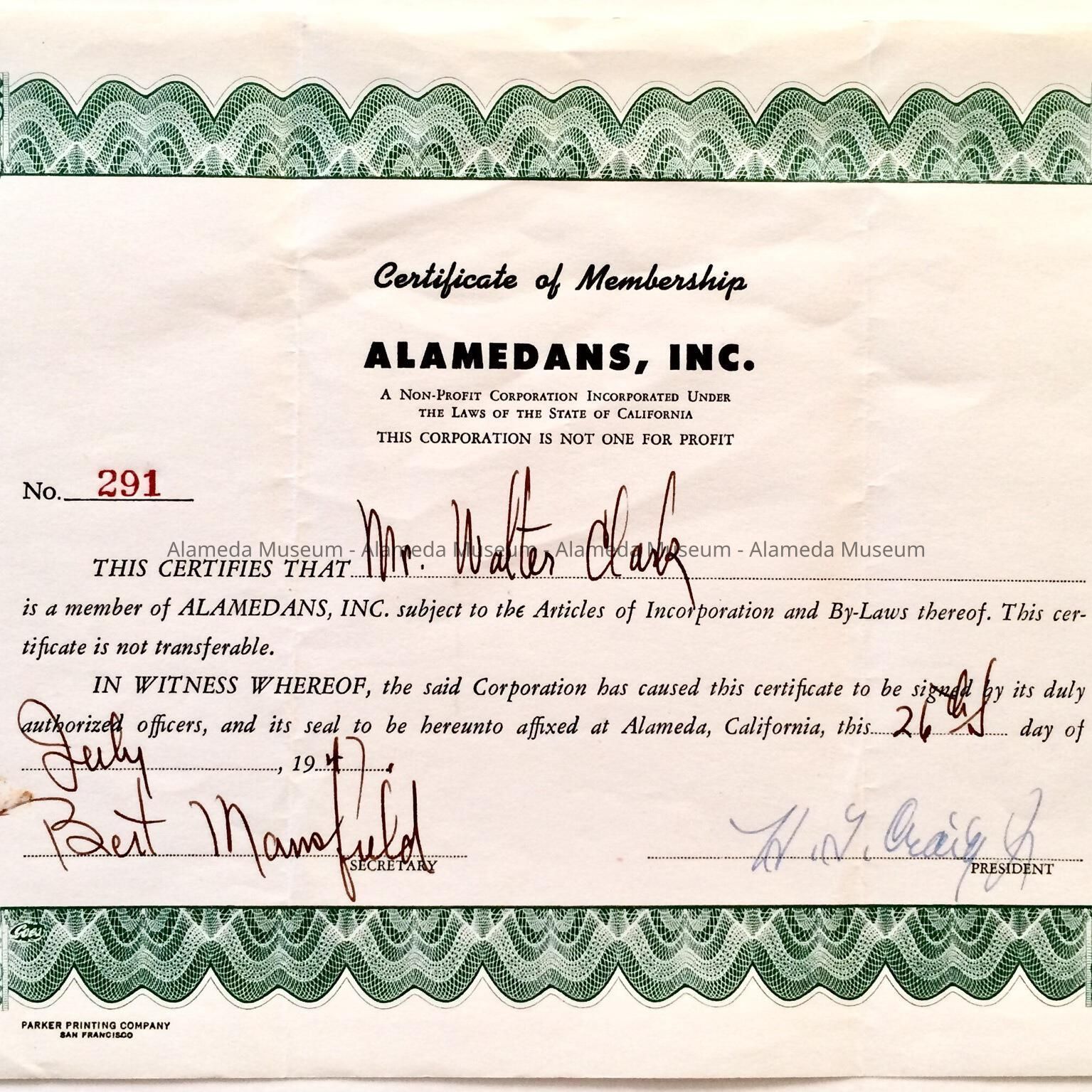 CERTIFICATE OF MEMBERSHIP FROM THE ALAMEDANS, INC., A NONPROFIT CORPORATION INCORPORATED UNDER THE LAWS OF THE STATE OF CALIFORNIA. THE DOCUMENT CERTIFIES THAT WALTER CLARK IS A MEMBER OF THE CORPORATION, AND IS DATED JULY 26, 1947.