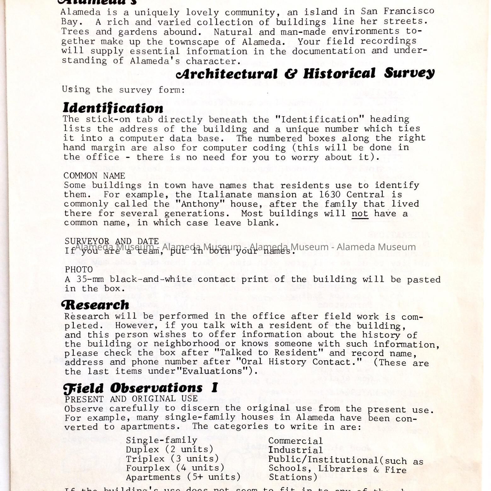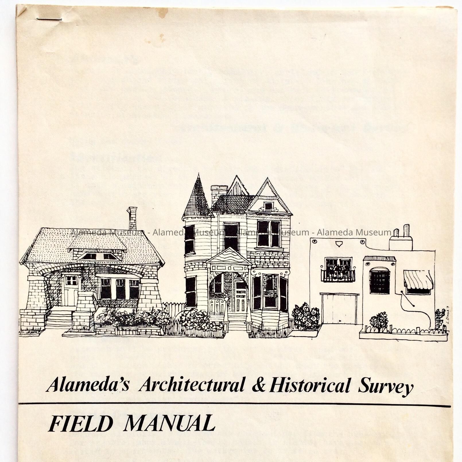 DESCRIPTION: A SOFT-BOUND ILLUSTRATED MANUAL. THE COVER HAS DRAWINGS IN BLACK AND WHITE OF PERIOD HOMES AND THE CAPTION, "ALAMEDA'S ARCHITECTURAL AND HISTORICAL SURVEY FIELD MANUAL," IN BLACK-COLORED TYPE ON A WHITE-COLORED BACKGROUND.
