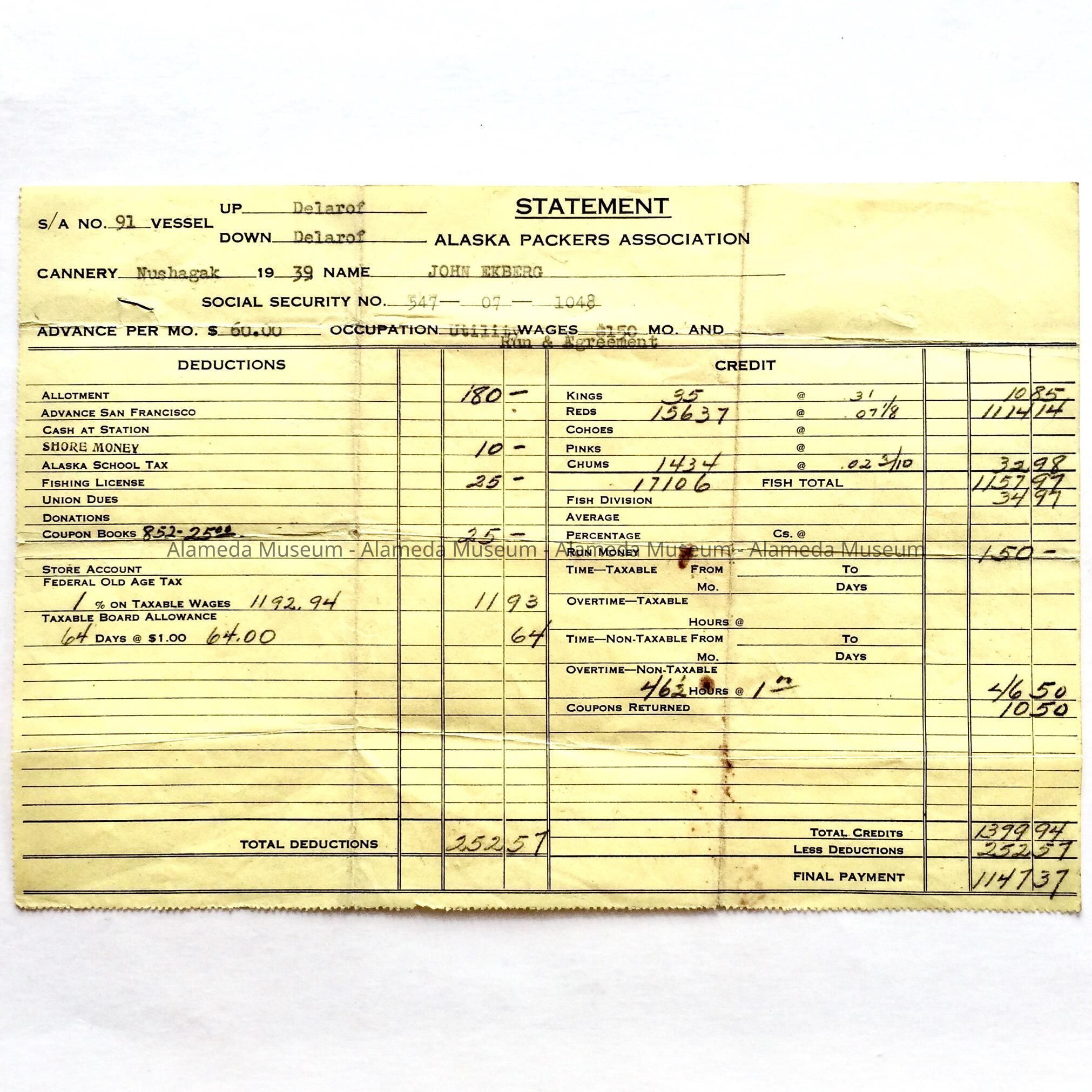 Alaska Packers Association Pay slip for work by John Ekberg, 1935Entry/Object ID