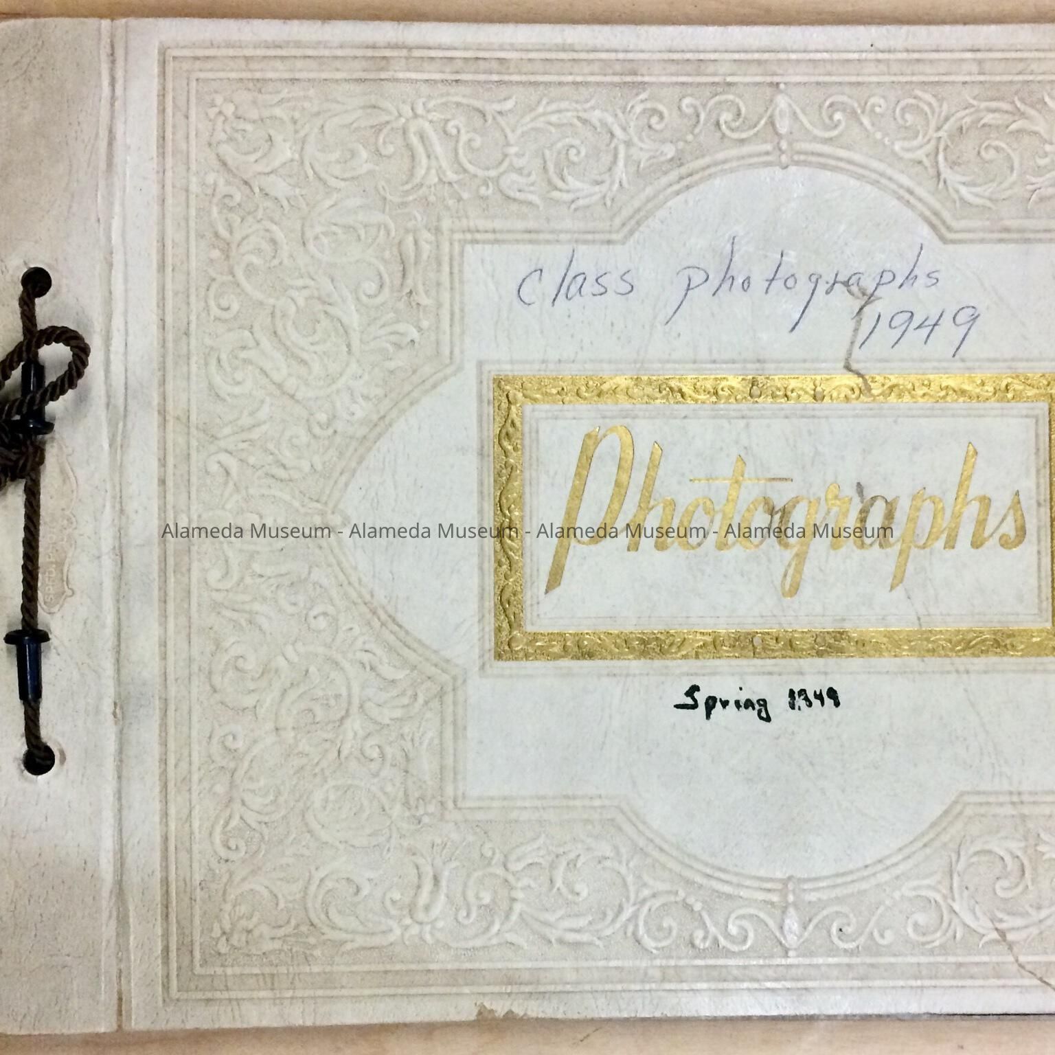 Description: A loose-leaf photo album with brown binding cord. The hard cover has an embossed caption: "PHOTOGRAPHS” in a gold colored type surrounded by an embossed classical design. The cover, itself, is of a tan color embossed to give an appearance of tooled leather.
