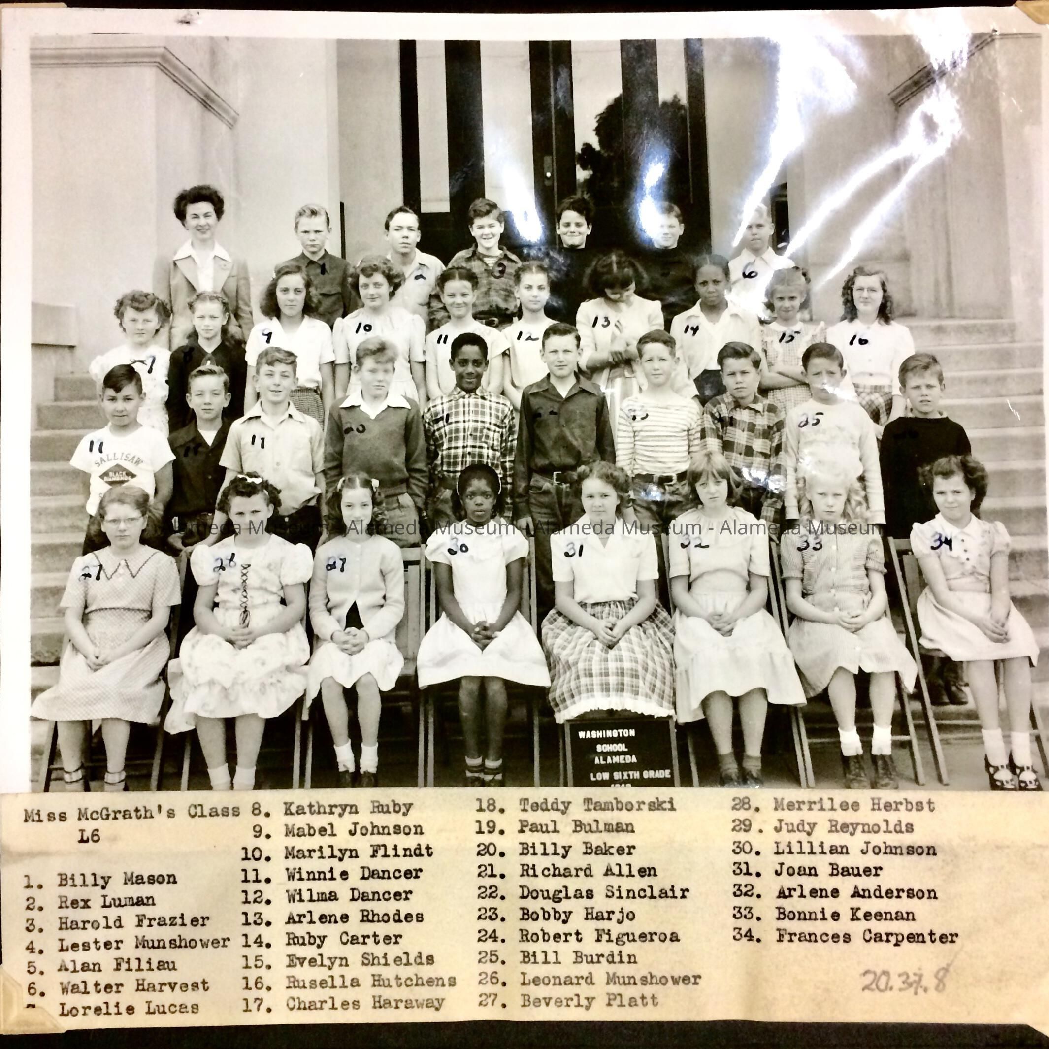 History of Object: An album containing black/white colored photos professionally taken by an unidentified photographer, of various grades (6th to 8th) attending Washington School. Each single photograph has numbers applied to it by the album's owner to identify the various students. Each student photo is numbered in ink with a typewritten label giving his or her's full name.