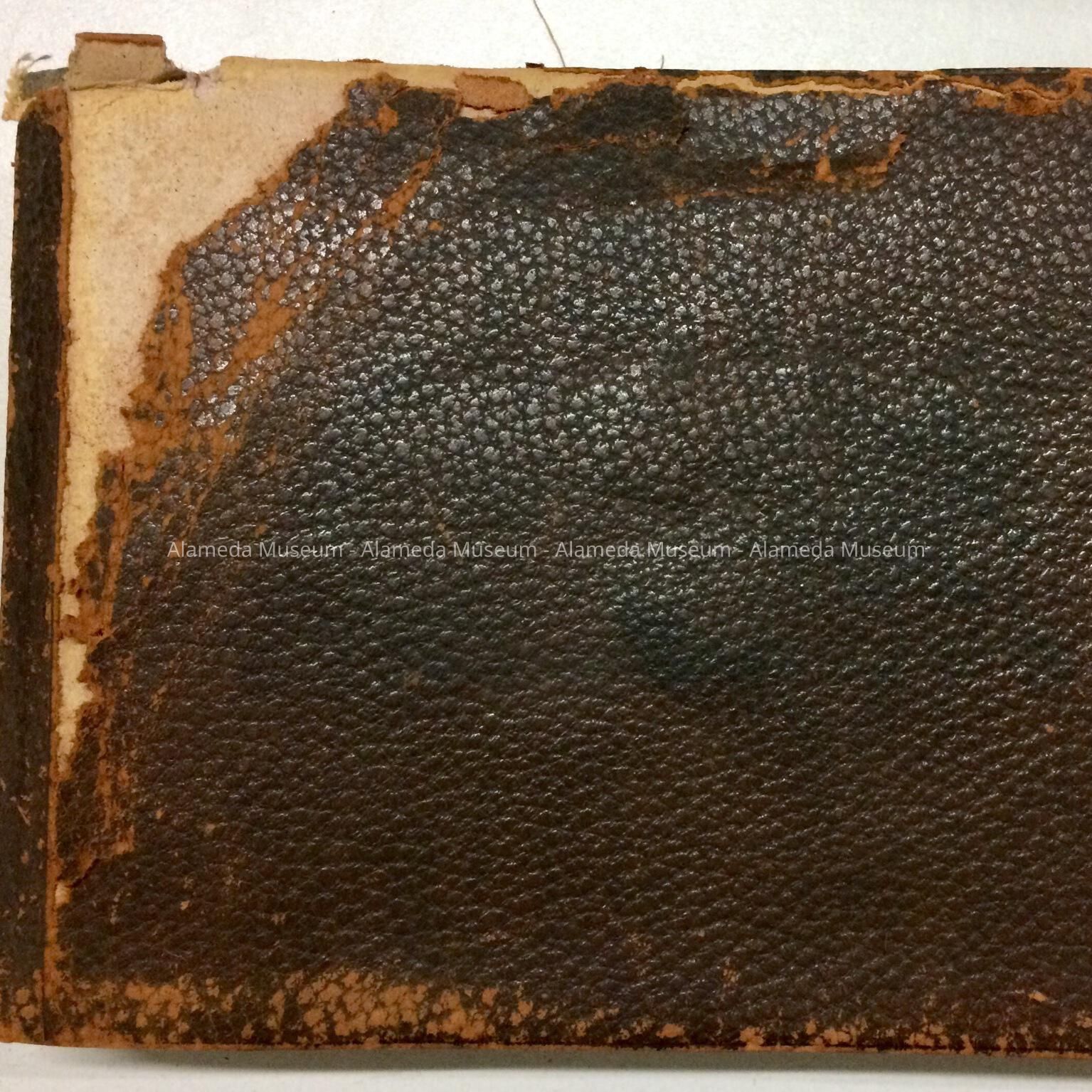 Description: Brown colored, leather covered photographic album. Grey colored interior pages. Photographs attached by paper corners.