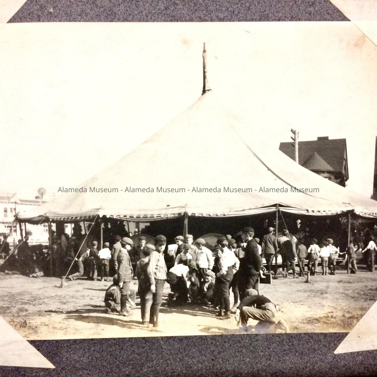 Collection of photographs taken by Frank W. Hartley of scenes of California with several including i.e. Alameda City Hall, tent with amusement ride Santa Clara and Oak (present site of Alameda Free Library), and what could be views of Fernside.