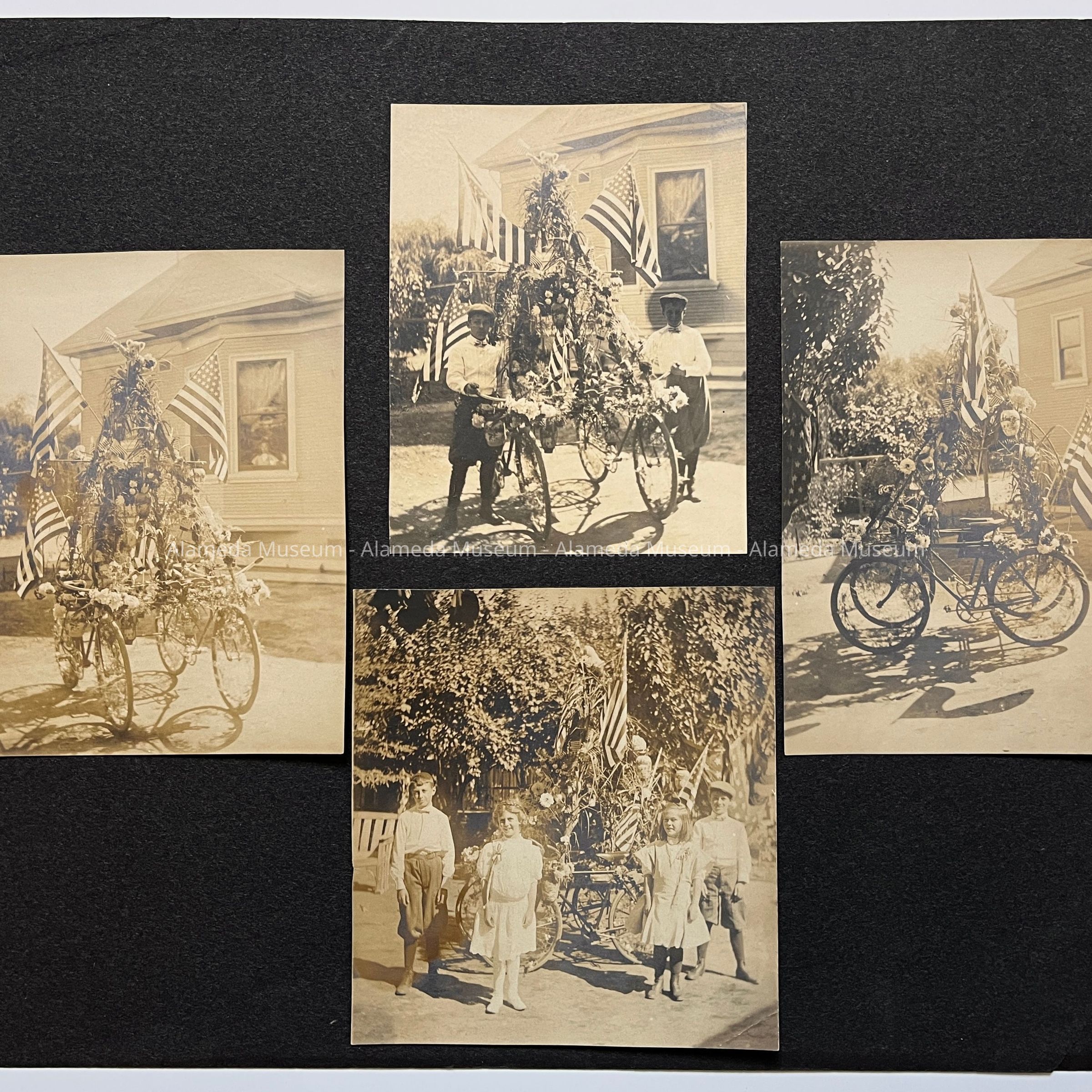 THE WEICHART CHILDREN --- HENRY LLOYD AND ANITA --- WITH THEIR BICYCLES DECORATED FOR A JULY 4 PARADE ARE PICTURED ON THE WEICHART PROPERTY AT 545 LINCOLN AVENUE, ALAMEDA.