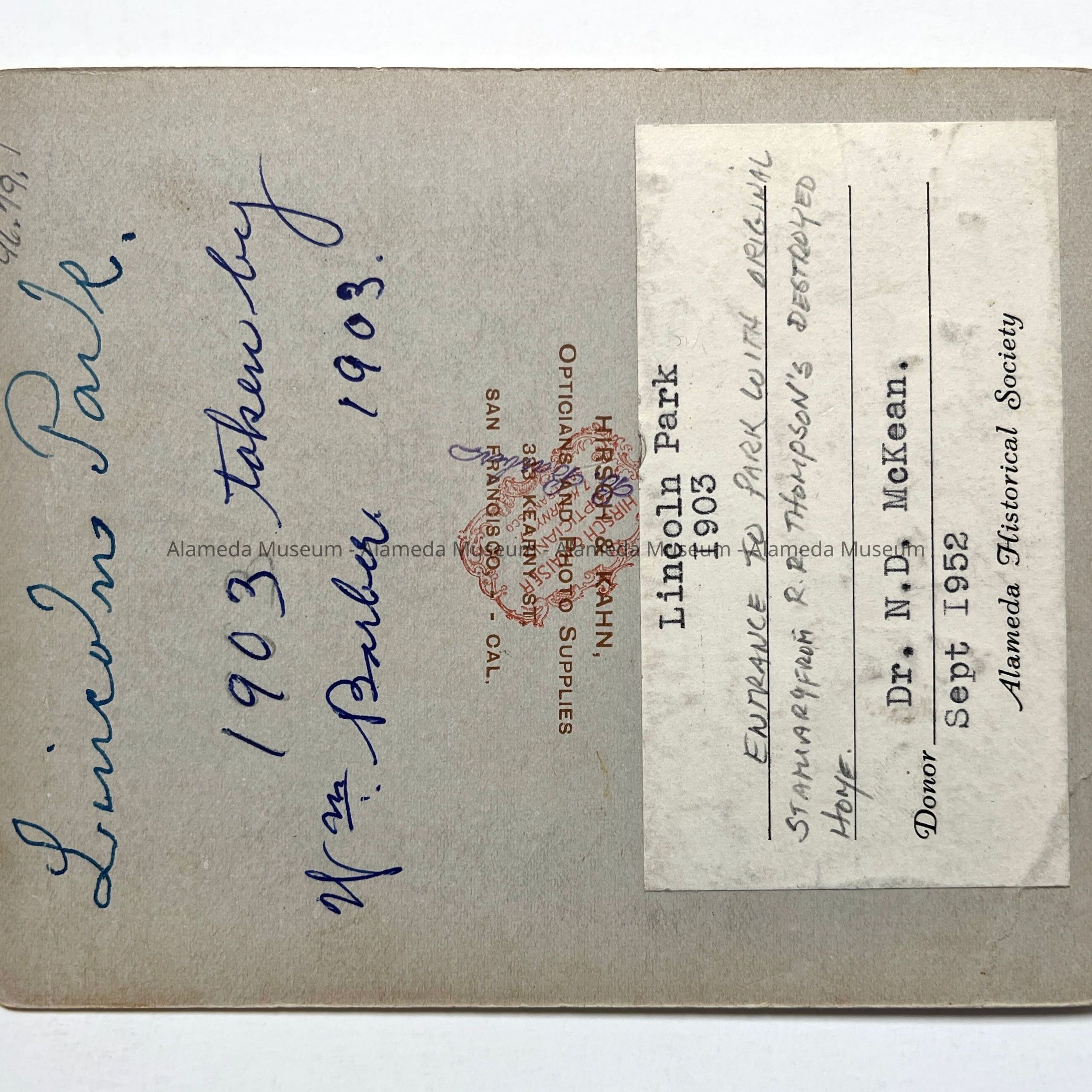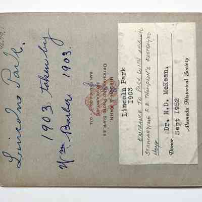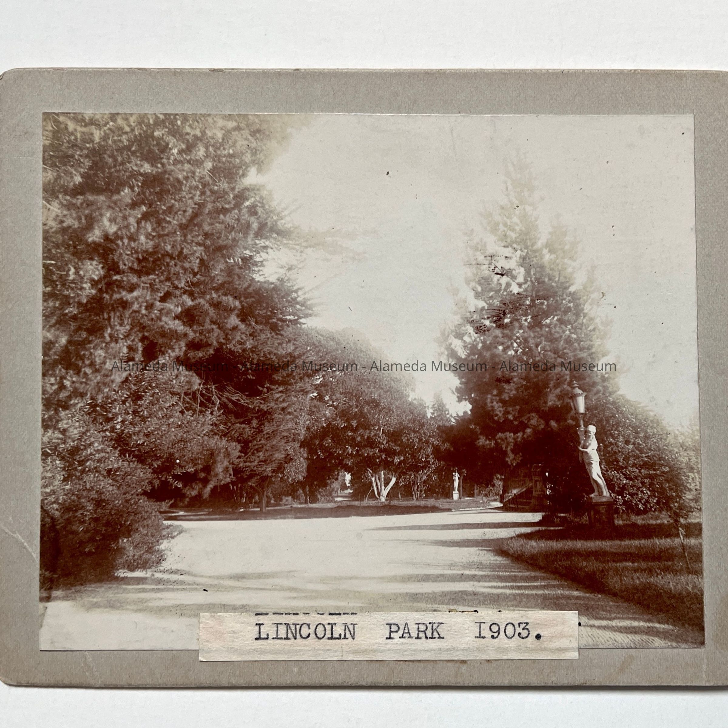 Albumen print photo of Lincoln Park entrance with R. R. Thompson statuary, 1903Entry/Object ID
