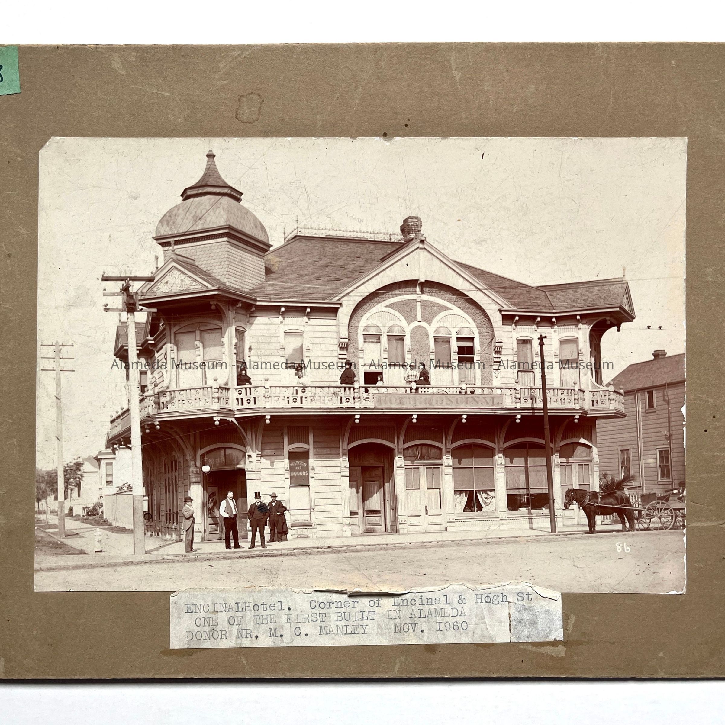 View of the old Encinal Hotel located at the corner of Encinal Avenue and High Street (structure is still standing, with modifications). Hotel guests are standing on front sidewalk and along the upper balcony.