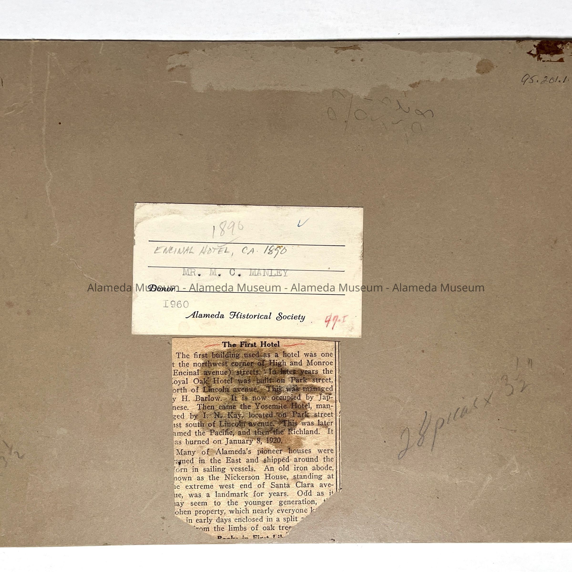 Albumen print photo and newspaper clipping of Encinal Hotel, c. 1890Entry/Object ID