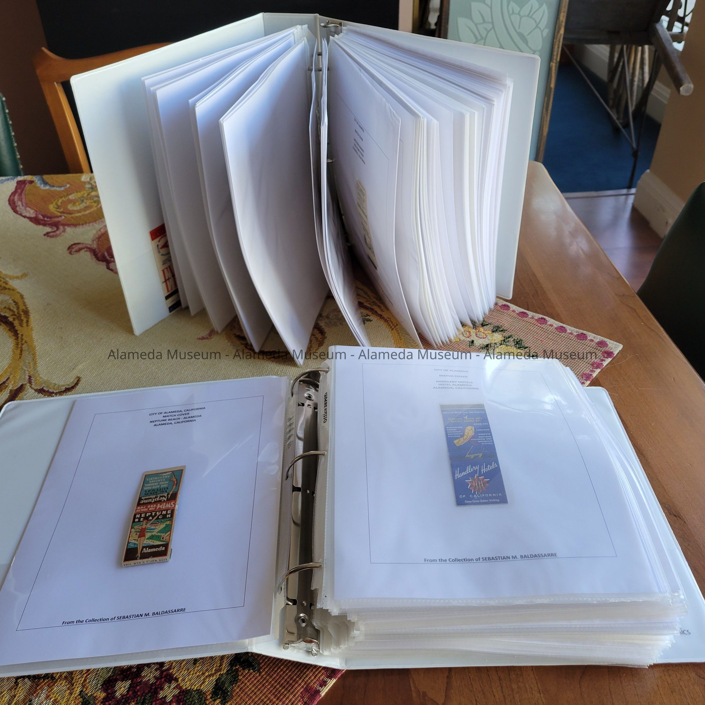 Description: Two binders containing matchbook covers from Alameda businesses. Each cover is attached to its own page, with a short typed description and placed inside a protective plastic sleeve. “From the Collection of SEBASTIAN M. BALDASSARRE” is typed along the bottom of each page. Binder A has 83 pages and a Neptune Beach matchbook with matches (see photo). Binder B has 65 pages, with four additional covers tucked into the flap on the inside of the binder’s front cover.