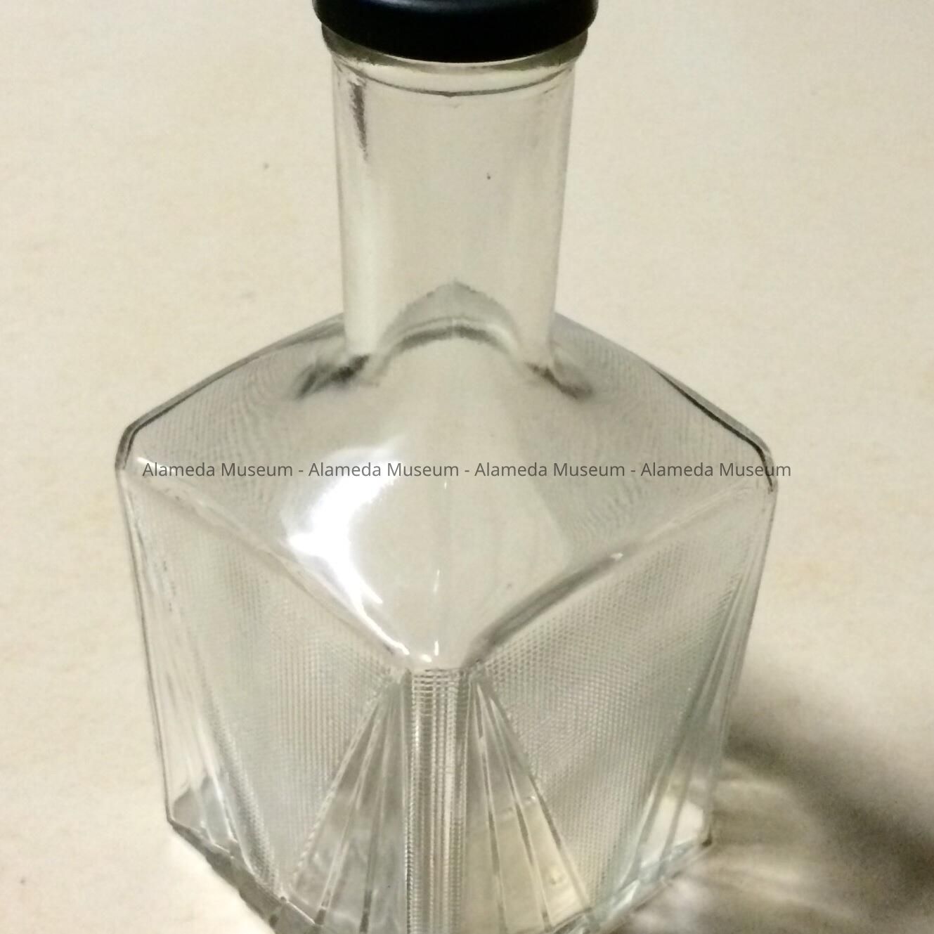 Description: A flat sided, square-shaped clear glass water bottle with a metal screw top with an embossed art deco-style design. It is signed on its base, "Alhambra Pure Spring Water".