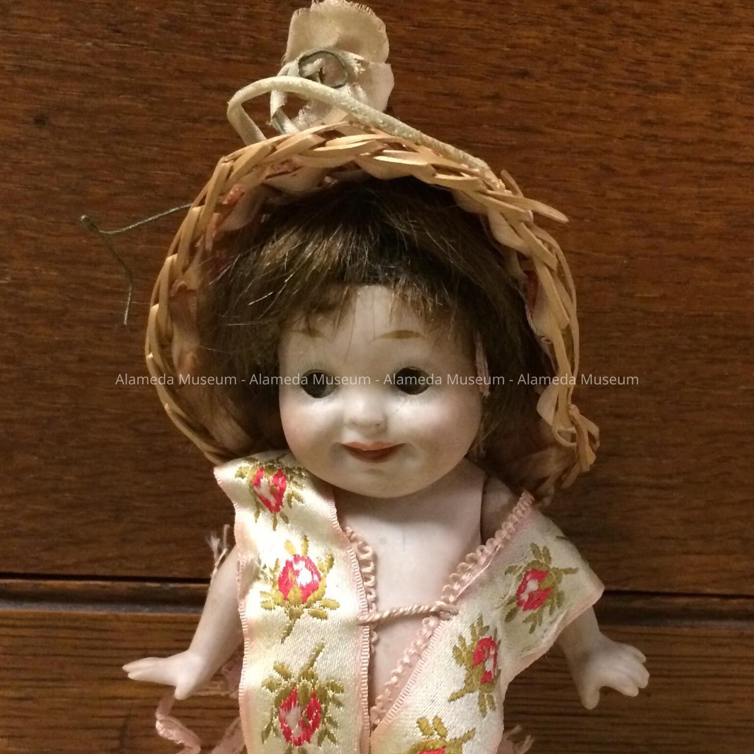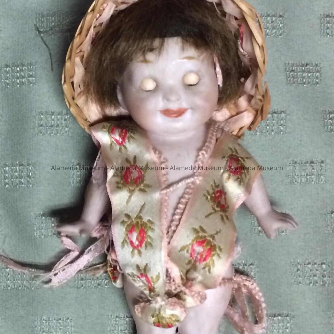 History of Object: All bisque "Googly-Eyed doll" (resembling a Kewpie doll in pose) which belonged to Eleanor Clark as a child, member of an old-time Alameda family.