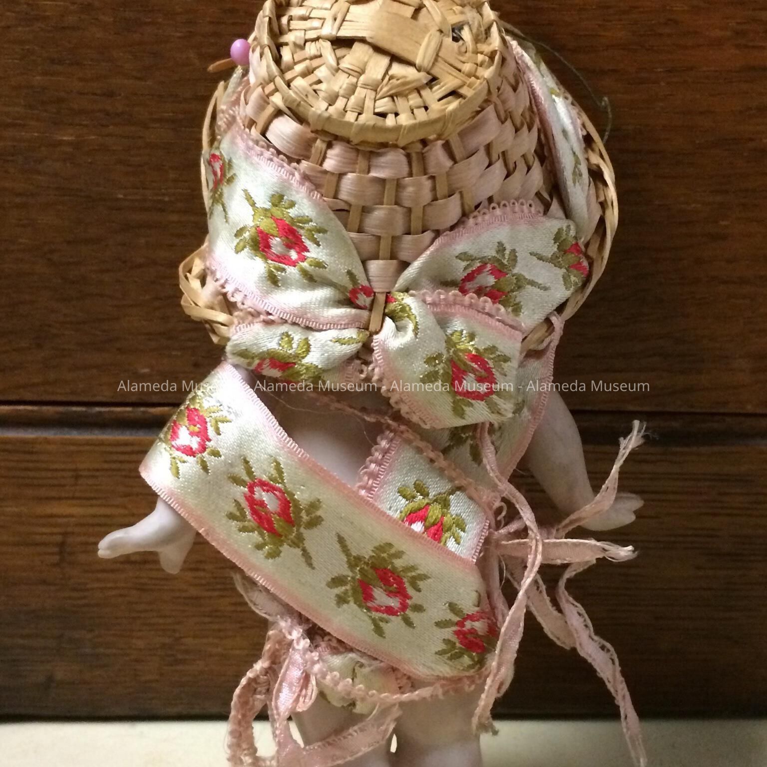 All bisque Googley-Eyed doll with silk ribbon dress and straw hat, c. 1910-1912Entry/Object ID