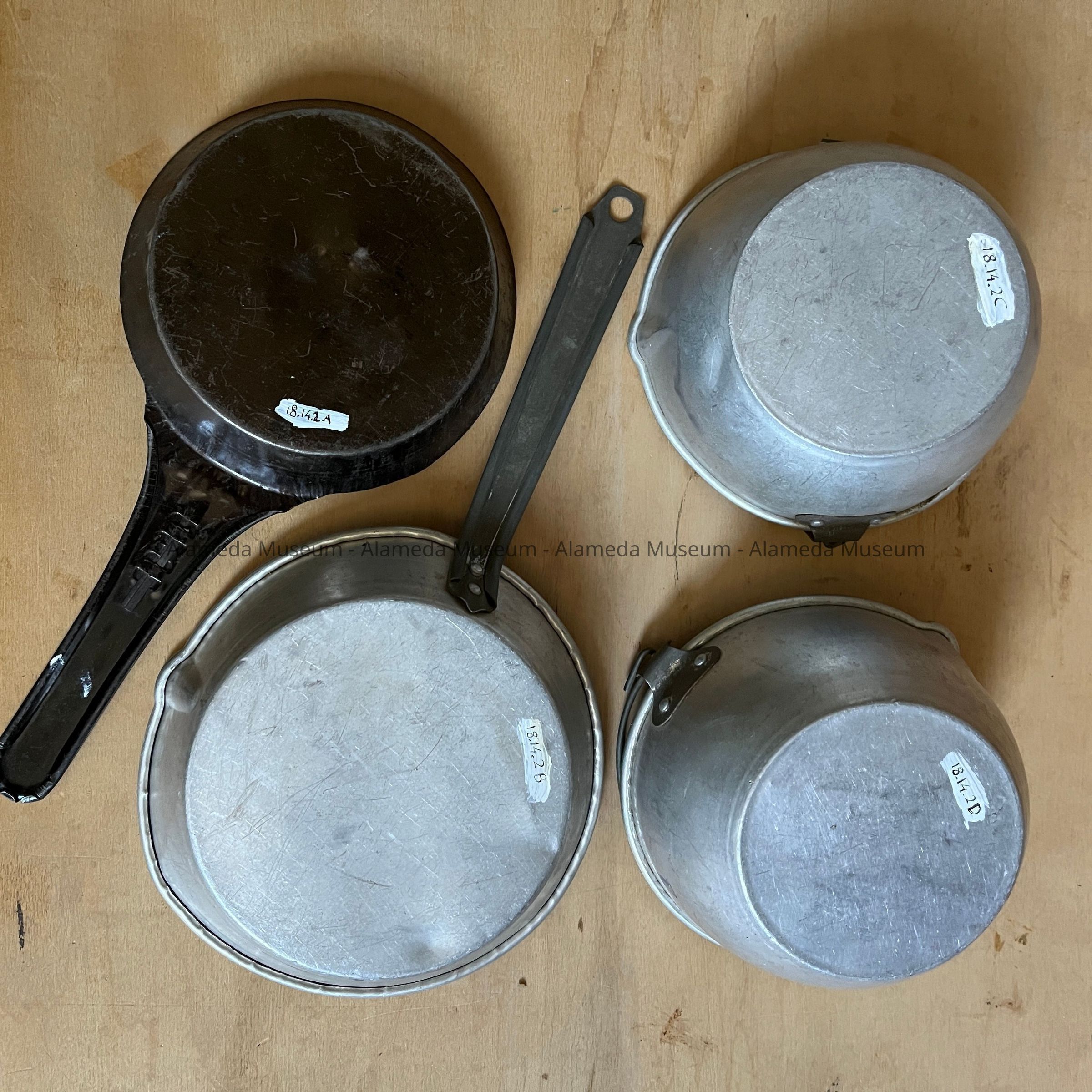 Description: A set of children’s miniature pots and pans consisting of two frying pans, one is black, and two cooking pots with bail handles. All are made of aluminum with iron handles.
