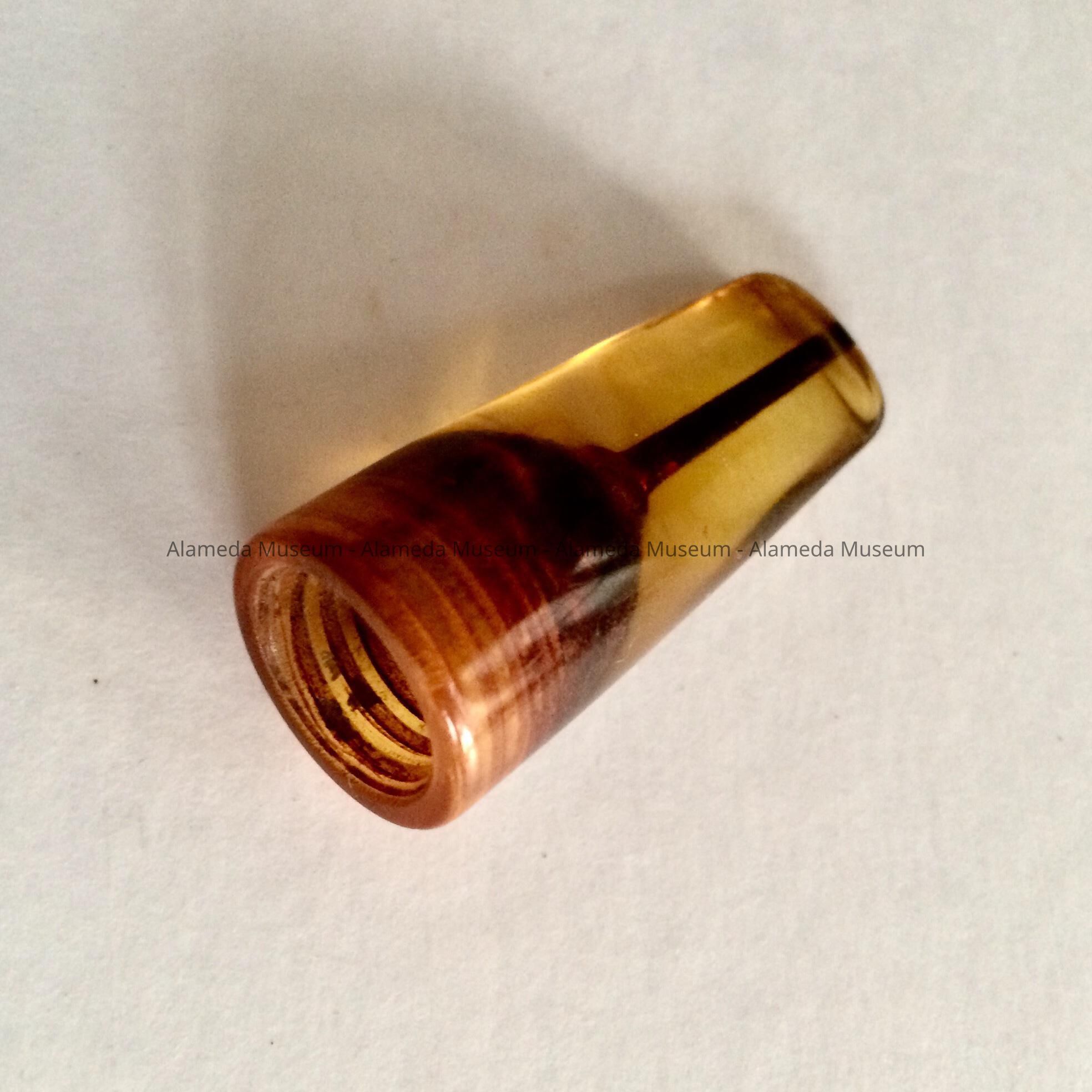 Description: an amber-colored Bakelite object, with on one end, a screw-thread leading to a tapered hollow, ending in a narrow channel leading through the object, and on the other side, a flattened oval section. No marking.