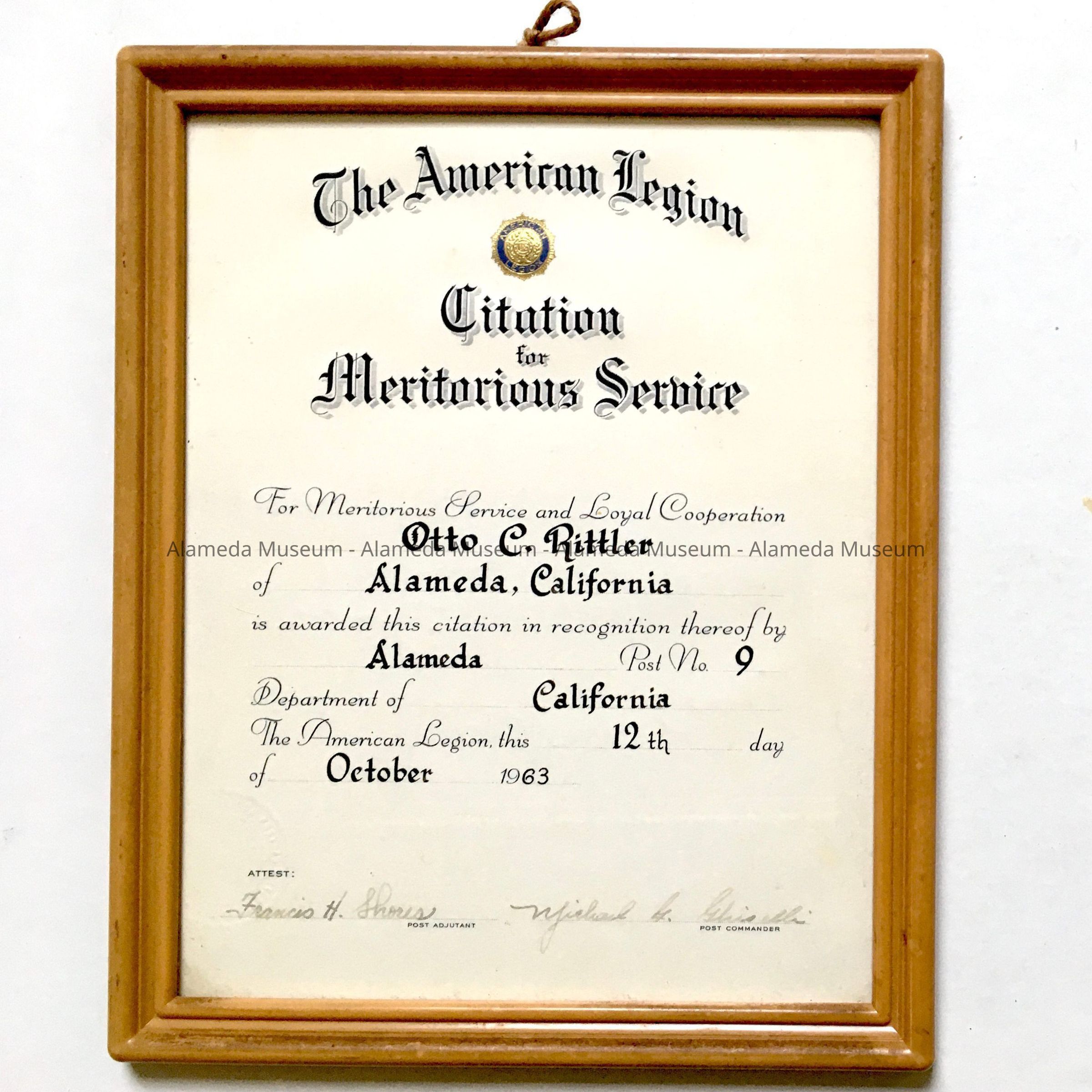 Description: Framed American Legion citation for meritorious service, presented to Otto C. Rittler on October 12, 1963. Citation was awarded in recognition of service and loyal cooperation by American Legion Post No. 9, Department of California. Citation is in a beige plastic frame.