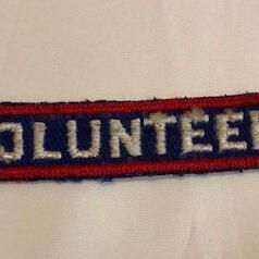 EMBLEM (OR BADGE) OF EMBROIDERY ON FABRIC, IN RED-, BLUE-, AND WHITE-COLORED SILK THREAD. THE BADGE IS LABELED, "VOLUNTEER," IN BLACK-COLORED LETTERS.