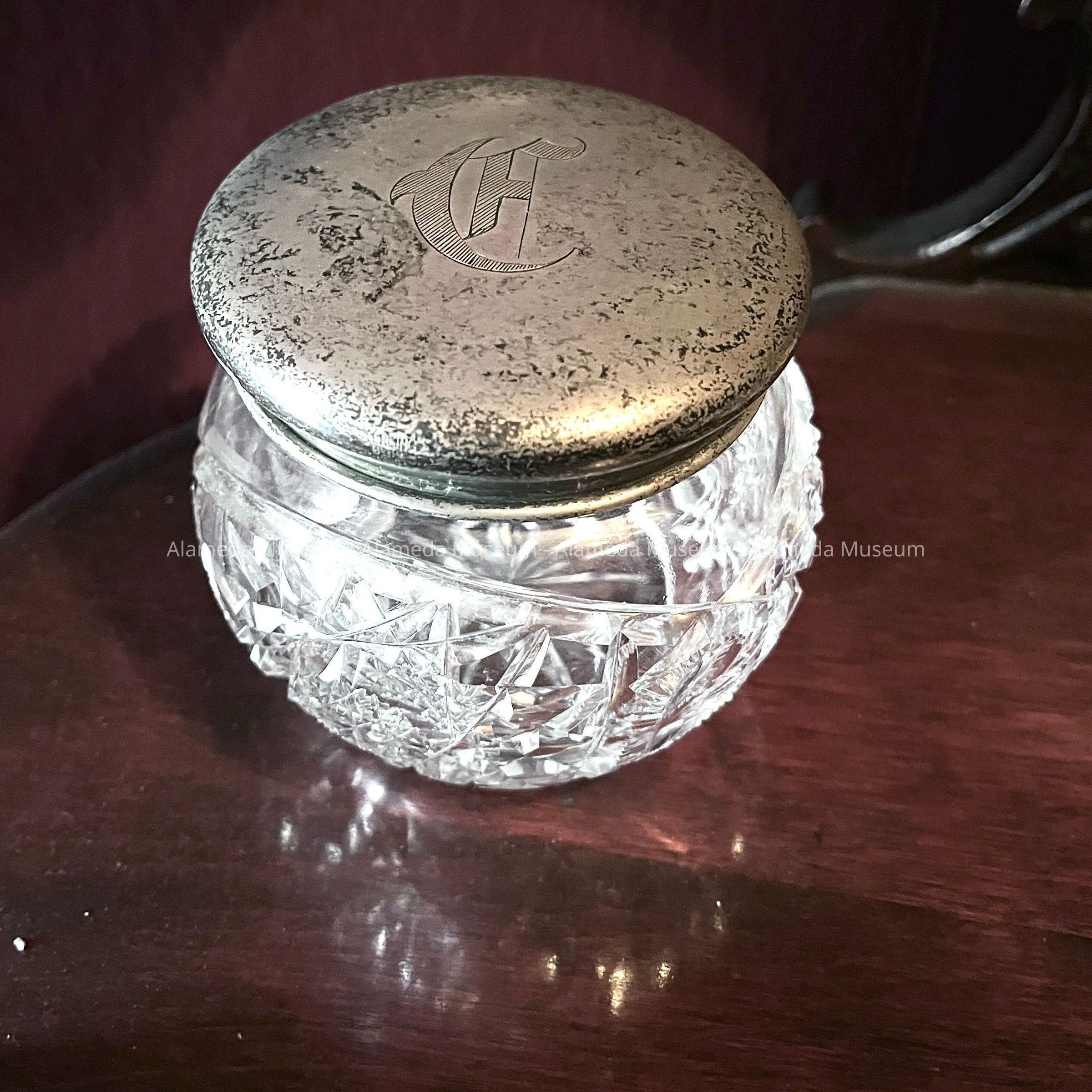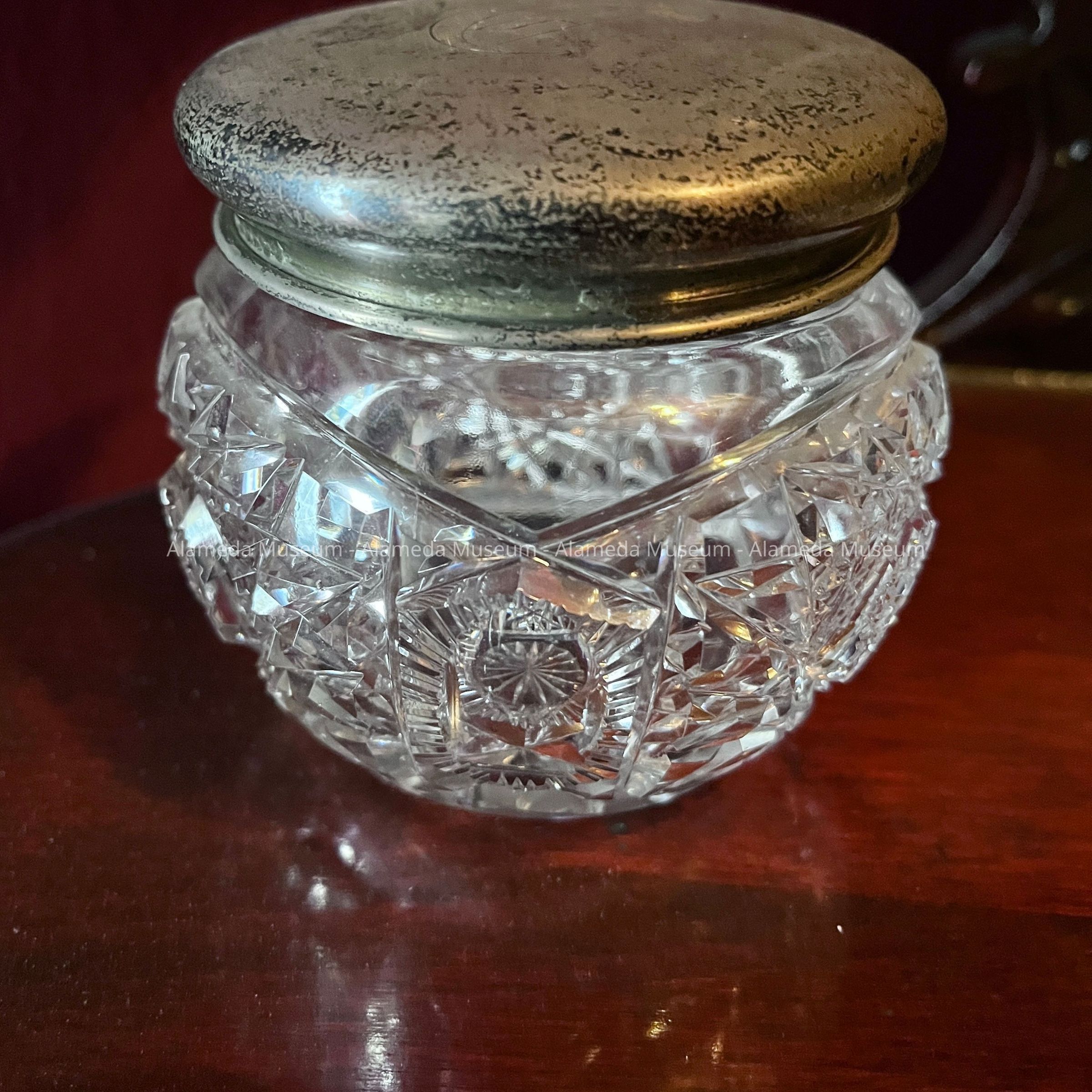 B. CUT CRYSTAL GLASS POWDER JAR, WITH STERLING SILVER LID: H 3-1/4" X D 3-1/4"