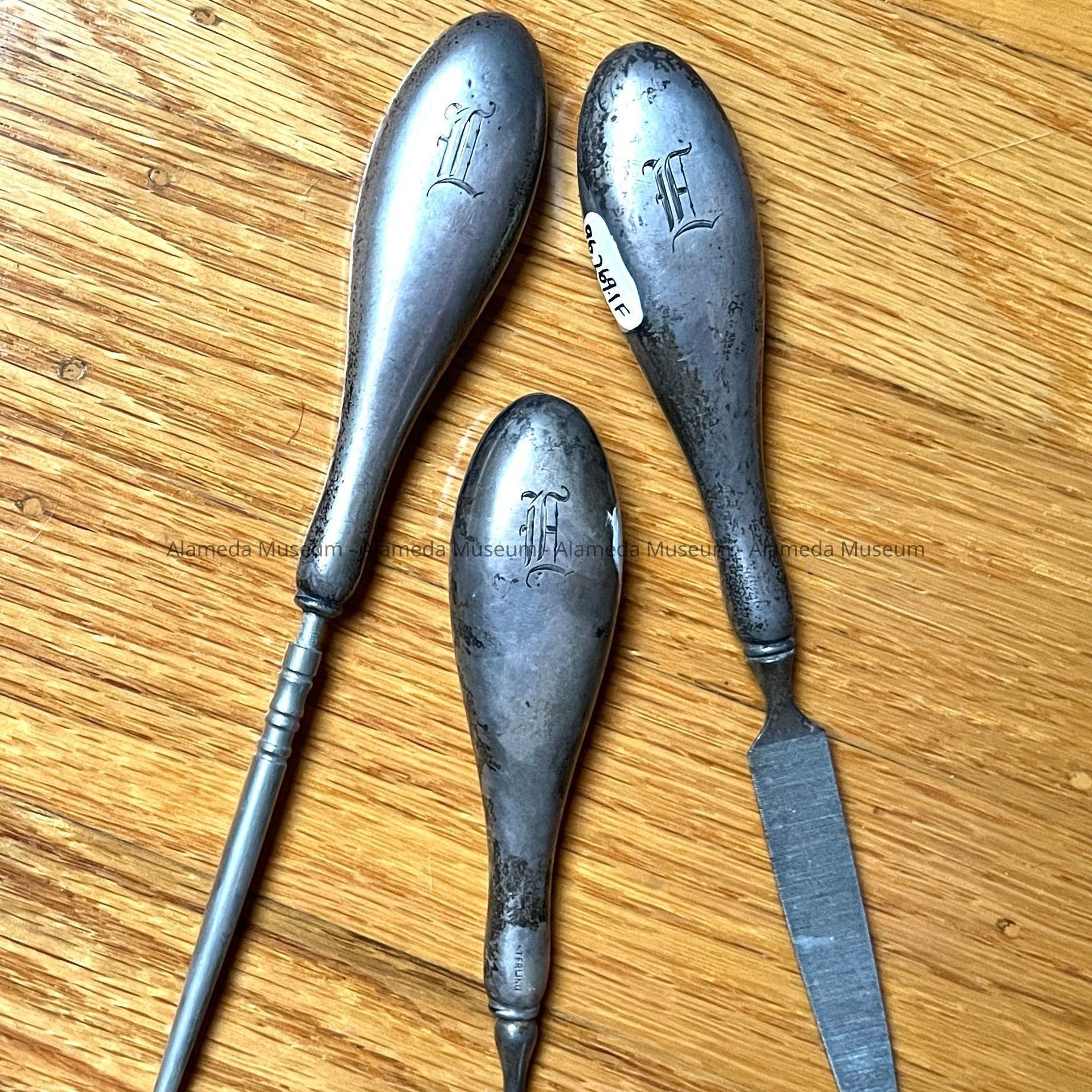 DESCRIPTION: AMERICAN STERLING SILVER DRESSER SET, WITH ENGRAVED INITIALS THAT APPEAR TO BE "C.F." THE FINGERNAIL FILE, BUTTON HOOK, AND CUTICLE CUTTER APPEAR TO HAVE AN "E" AS AN ENGRAVED INITIAL FOR "ELVIRA." STERLING SILVER IS PLAIN AND HAS NO DESIGN WITH THE EXCEPTION OF THE INITIAL.