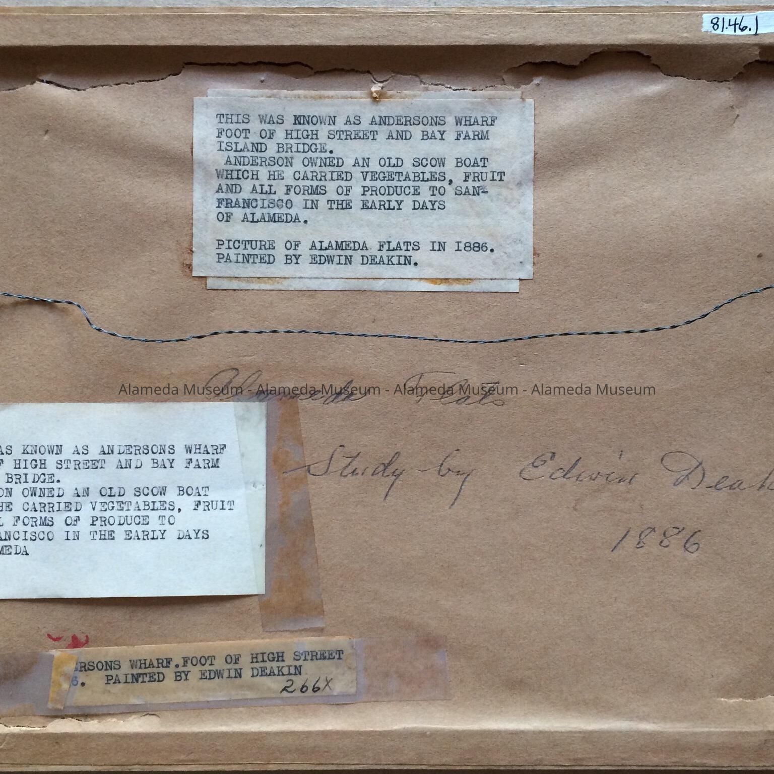History of Object: This is a painting of Andersons Wharf, at the foot of High Street and Bay Farm Island Bridge. Anderson owned an old scow boat which he carried vegetables, fruit, and all forms of produce to San Francisco in the early days of Alameda. Picture of Alameda Flats in 1886.
