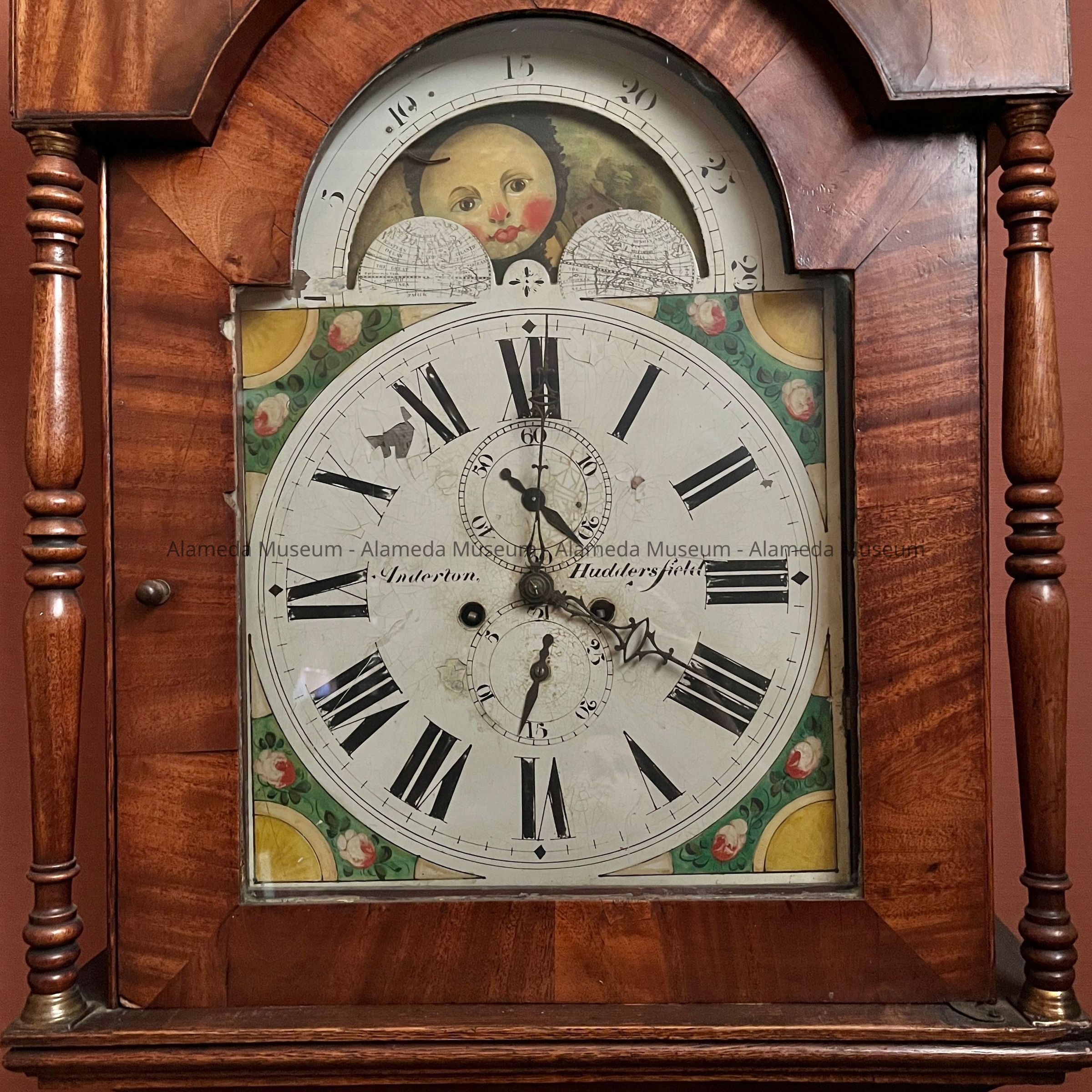 CLOCK GIVEN TO THE ALAMEDA HISTORICAL MUSEUM BY MRS ANNIE WOOD AND SONS CYRIL AND HOWARD, AND HERETOFORE NOT CATALOGED. THE CLOCK WAS DISPLAYED FOR MANY YEARS ON THE LANDING OF THE ALAMEDA FREE LIBRARY AT SANTA CLARA AVENUE AND OAK STREET, ALAMEDA. CLOCK WAS RECENTLY RETURNED TO THE ALAMEDA HISTORICAL SOCIETY.
