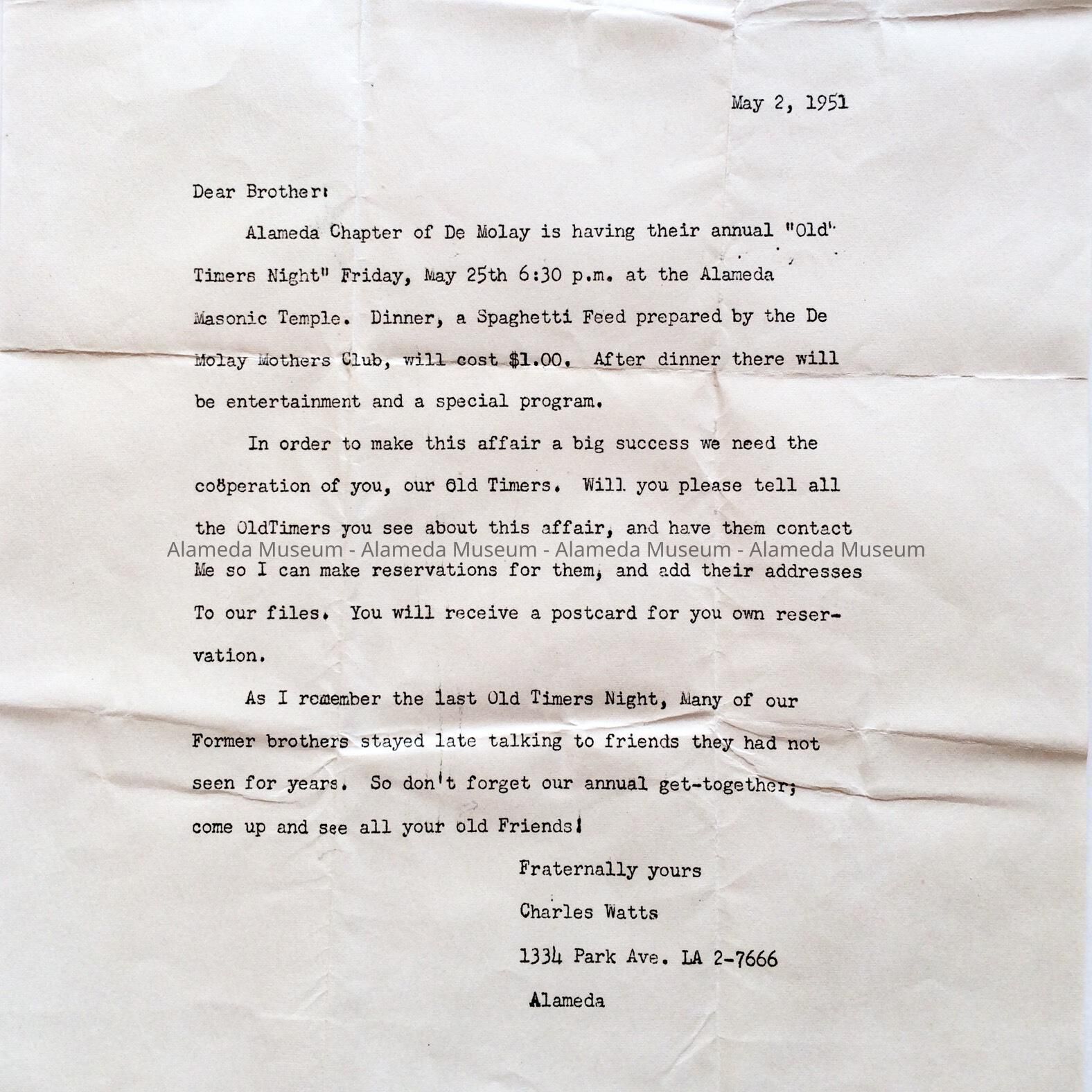 HISTORY OF OBJECT: AN ANNOUNCEMENT ON MAY 25, 1951 OF AN UPCOMING DINNER TO BE HELD AT THE ALAMEDA MASONIC TEMPLE BY THE ALAMEDA CHAPTER OF DE MOLAY.