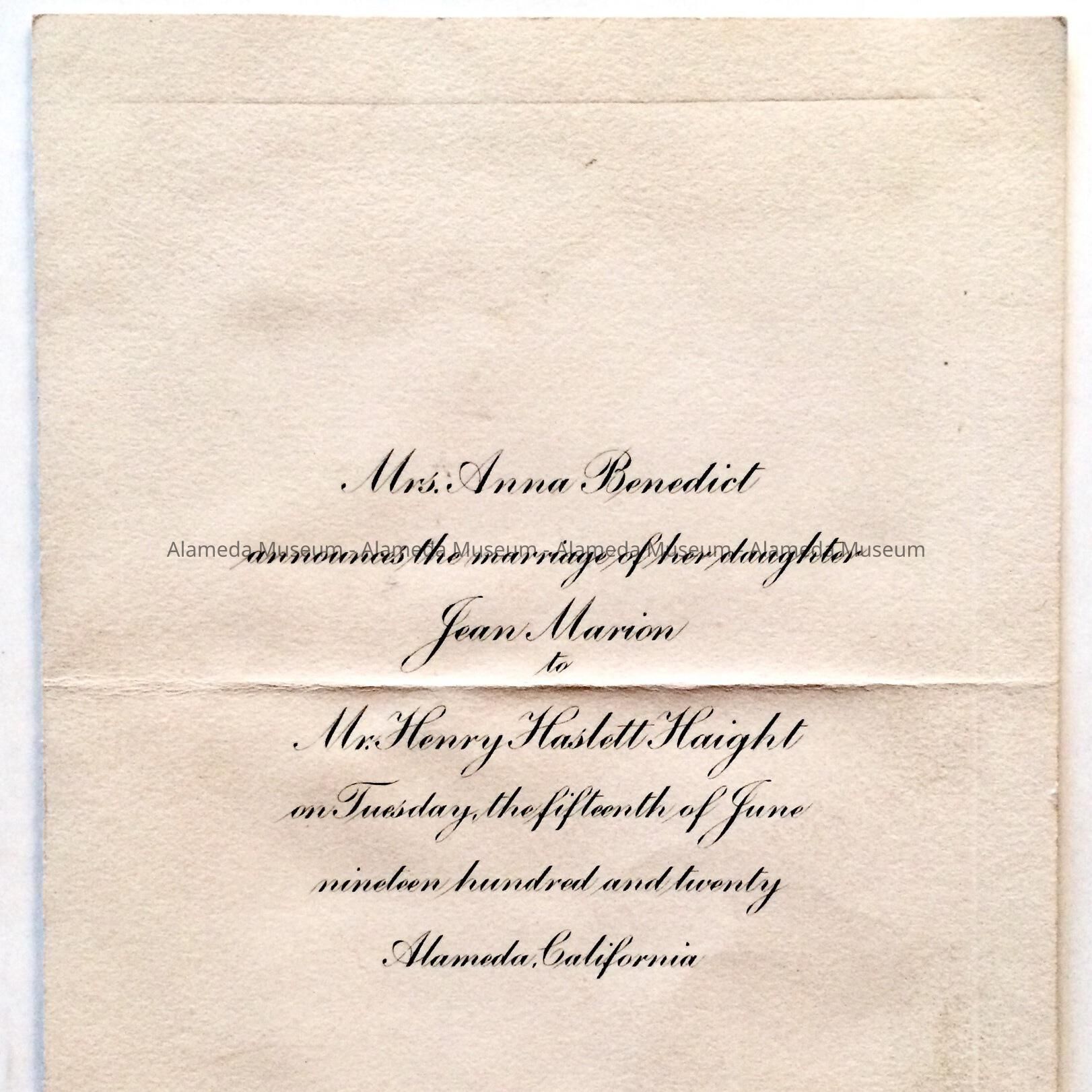 INVITATION (OR ANNOUNCEMENT) OF THE MARRIAGE OF HENRY HASLETT HAIGHT TO JEAN MARION, DAUGHTER OF MRS ANNA BENEDICT. CEREMONY SCHEDULED FOR JUNE 15, 1920.