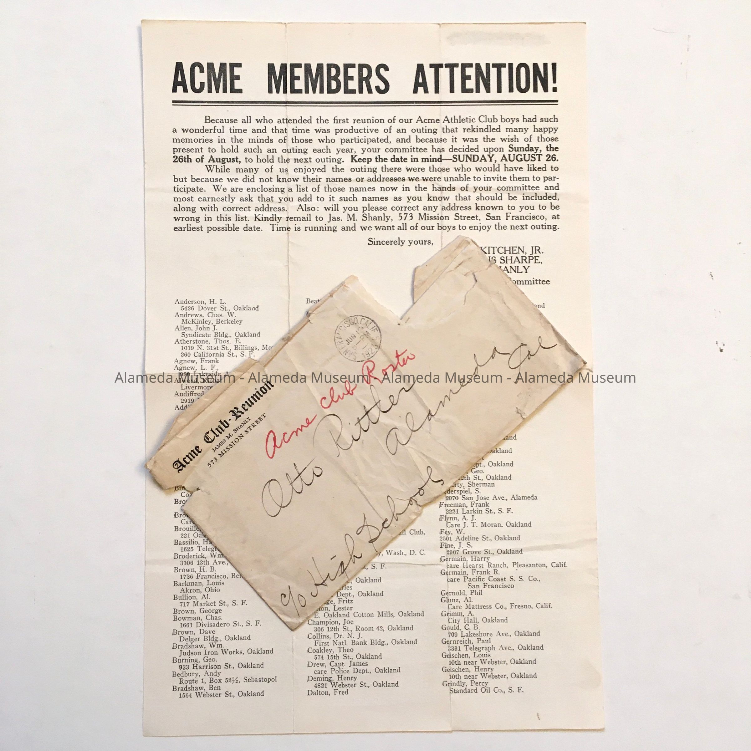 PRINTED ANNOUNCEMENTS, WITH BOLD-PRINTED CAPTION, "ACME MEMBERS," IN BLACK-COLORED TYPE ON A WHITECOLORED BACKGROUND. INCLUDED IS THE ORIGINAL ENVELOPE ADDRESSED TO OTTO RITTLER, c/o ALAMEDA HIGH SCHOOL.