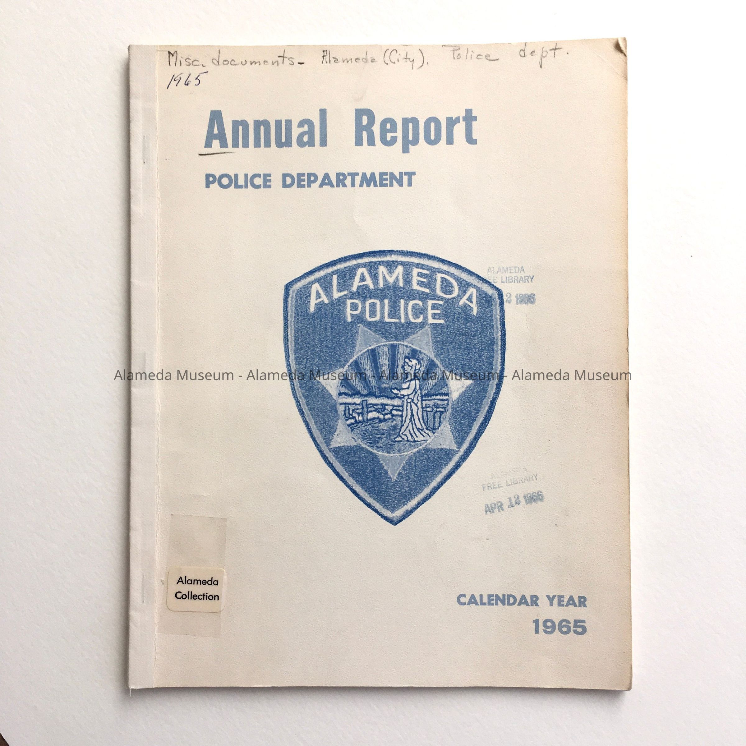 History of Object: Alameda City Police Department Annual Report for the 1965 calendar year. Prepared by City Manager, H. D. Weller, and Chief of Police, William A. Tulloh. Report includes information about crimes, staffing and services, and other police matters. In the introduction is mentioned that a number of officers attended the Oakland Police Academy.