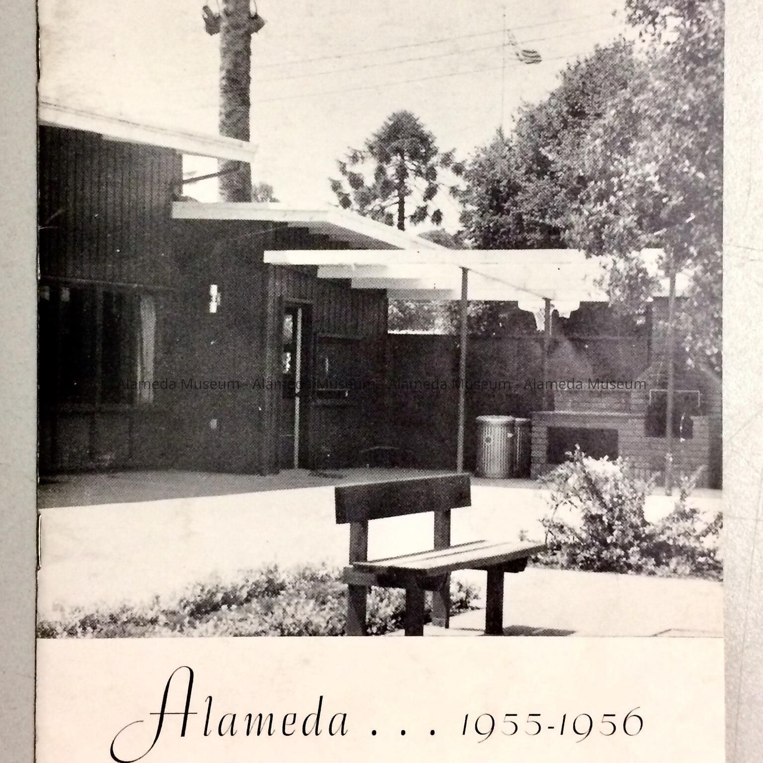 Booklet style publication, soft bound, with cover design of black and white photolithographic scene in bold printed caption "Alameda 1955–56".