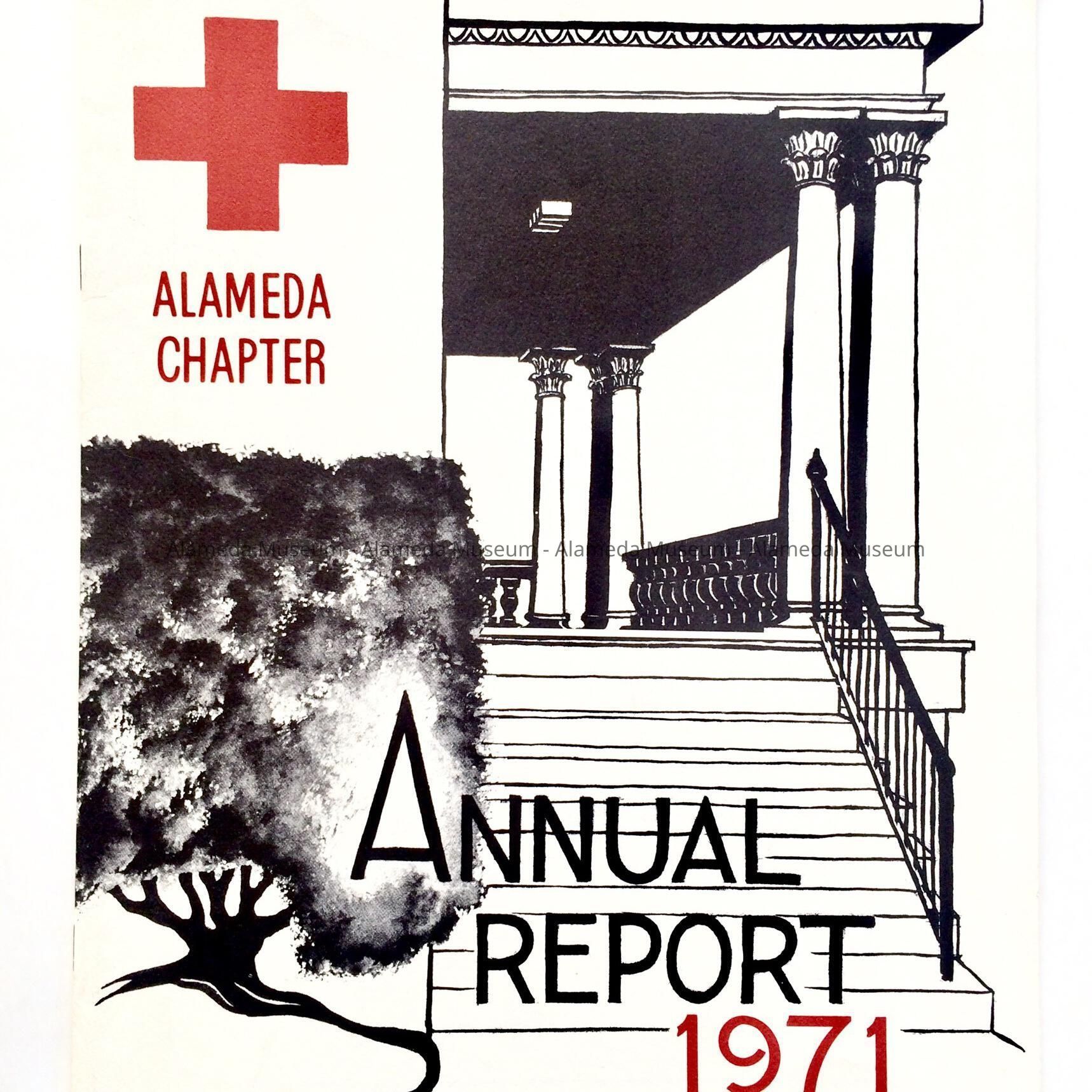 Description: Report (printed & illustrated), with soft cover illustrated with sketch of the portico and steps of the Red Cross building, 2017 Central Avenue, Alameda. Bold heading "Annual Report, 1971".