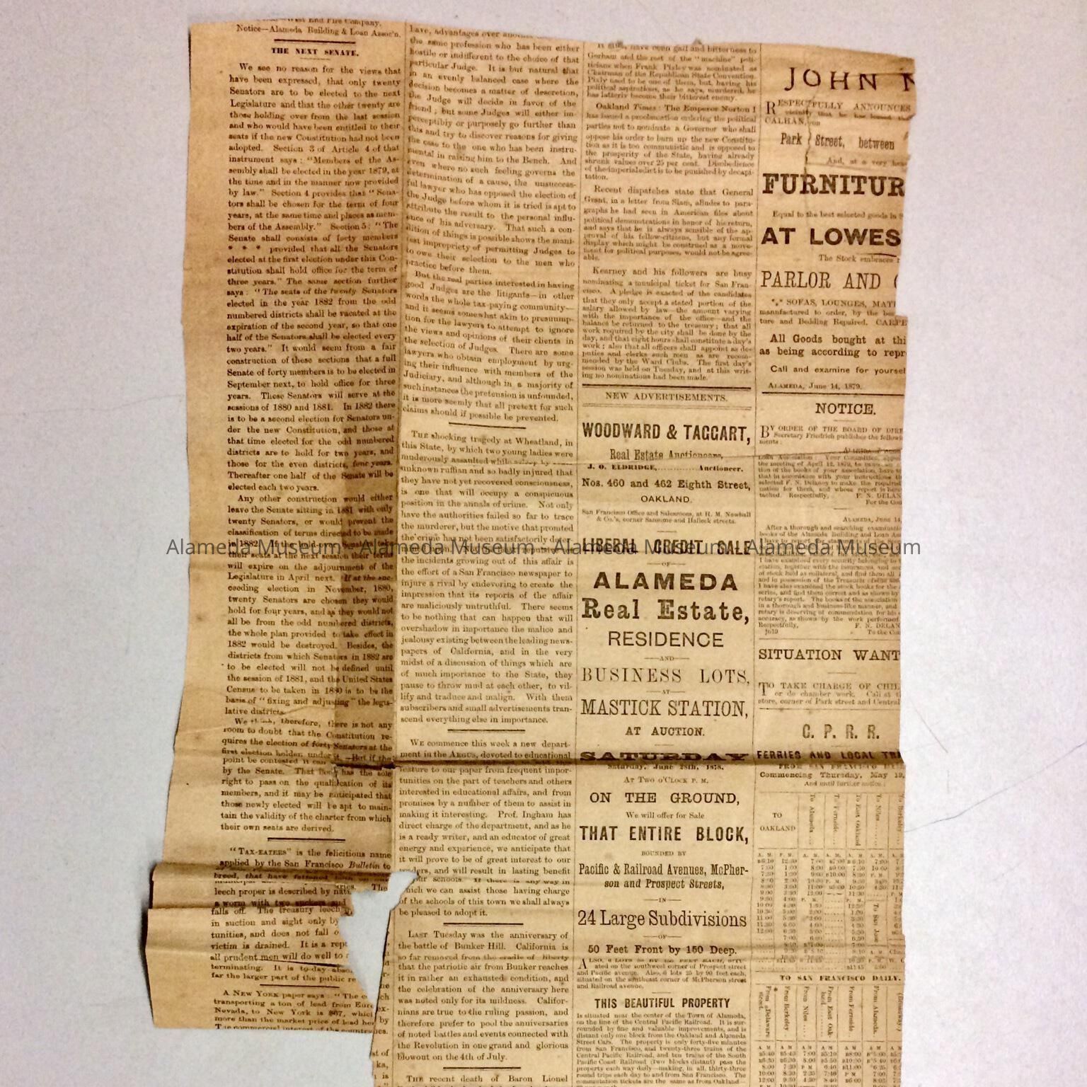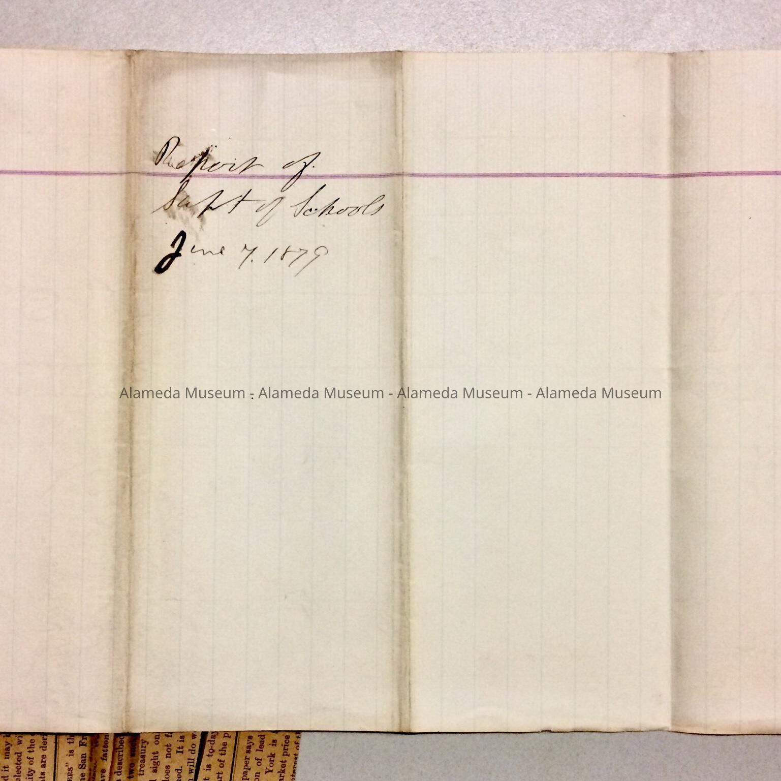 Description: Newspaper clipping, glued to a single piece of lined paper. Title of clipping 'Alameda Schools. Annual Report Upon the Same by Superintendent Ingham'. Paper has handwritten in black ink: Report of Suprt. of Schools. June 7, 1879.