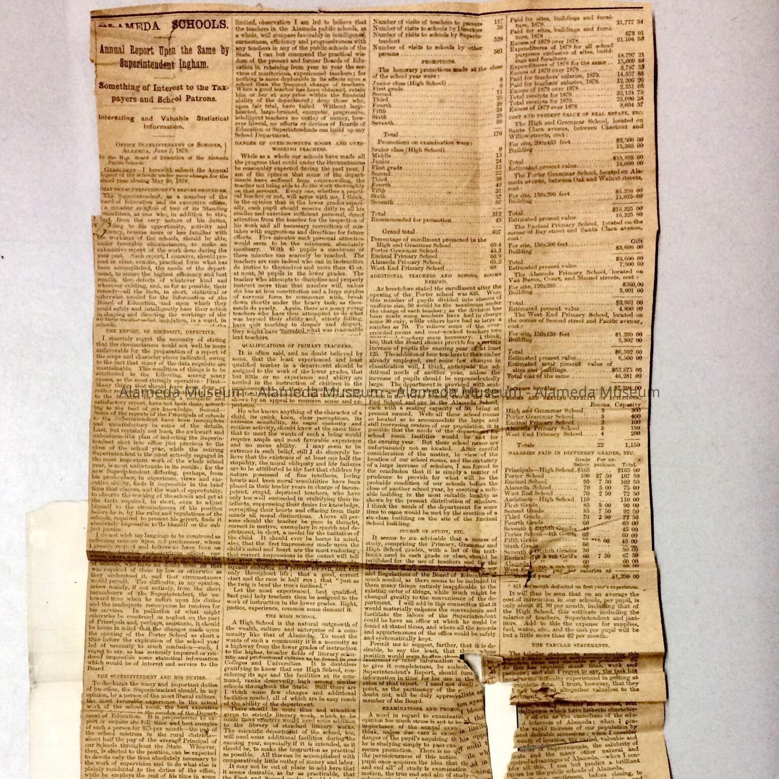 History of Object: Clipping of Annual Report by the Superintendent of Schools, for the year ending May 30, 1879. Describing enrollment, schools, promotions and the like.