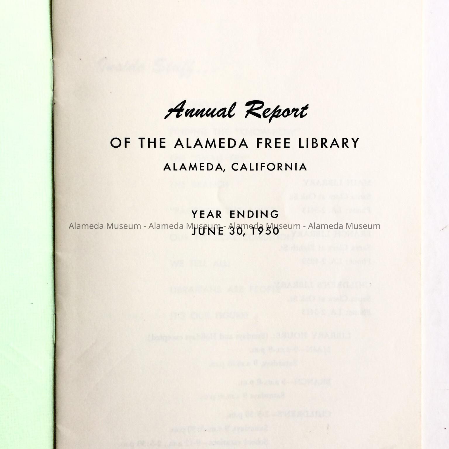 Annual report, Alameda Free Library, year ending June 30, 1950. Report includes a statistical summary, compiled number of circulations, finances, etc.