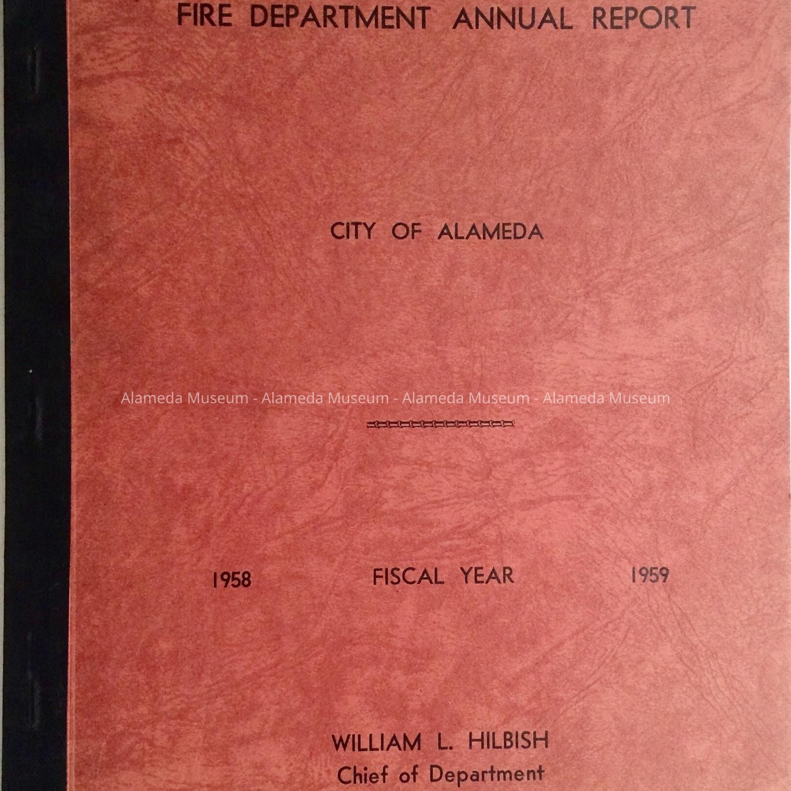 Softbound booklet with brown leather-look card stock cover, titled 'Fire Department Annual Report, City of Alameda, 1958 Fiscal Year 1959, William L. Hilbish, Chief of Department'.