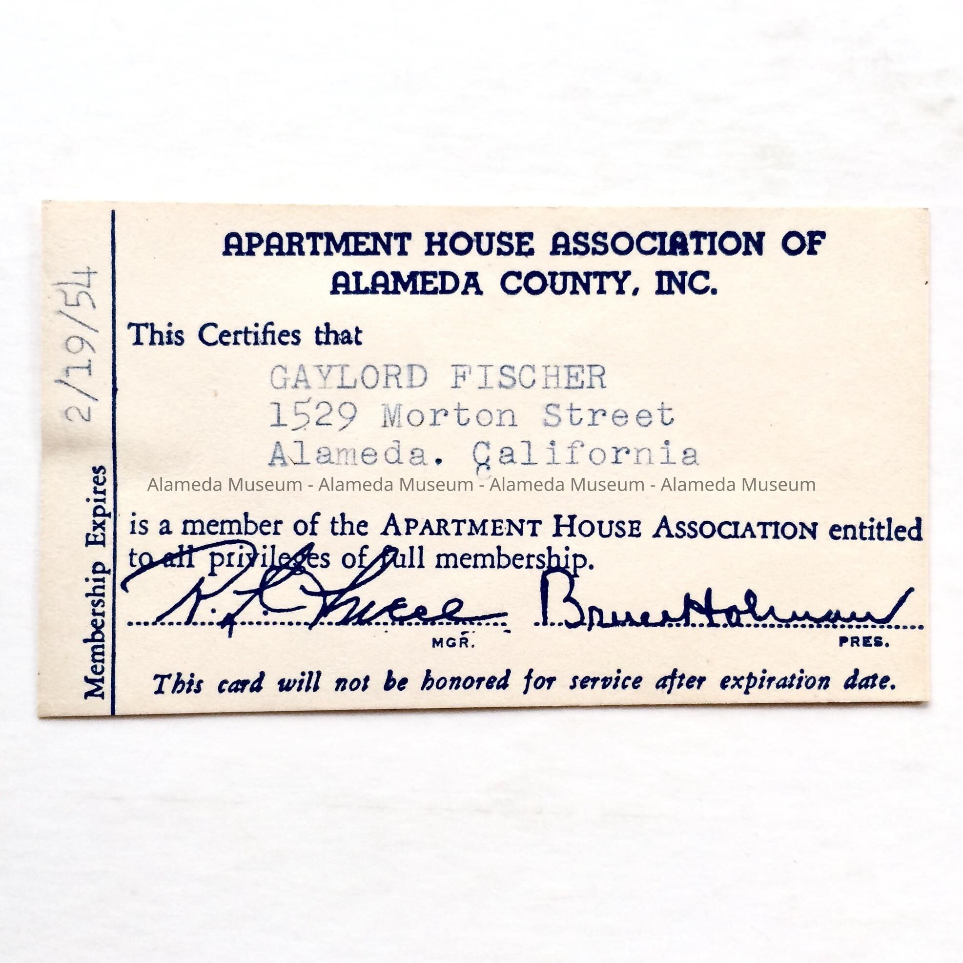 MEMBERSHIP CARD ISSUED TO GAYLORD FISCHER, 1529 MORTON STREET, ALAMEDA, CERTIFYING THAT HE IS A PAID MEMBER OF THE APARTMENT HOUSE ASSOCIATION OF ALAMEDA COUNTY, INC.