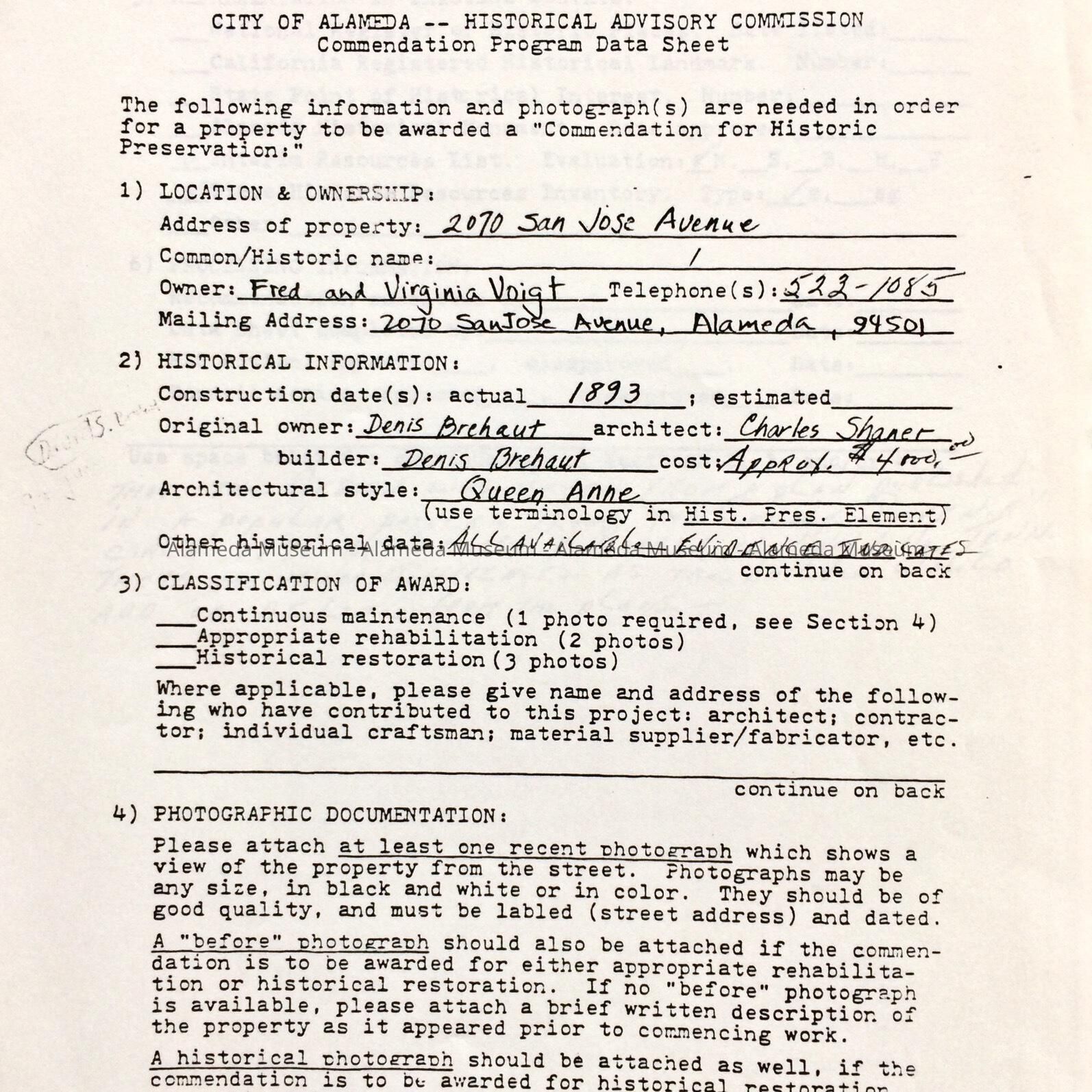 HISTORY OF OBJECT: AN APPLICATION FOR THE ACCOMMODATION PROGRAM UNDER THE AUSPICES OF THE HISTORICAL ADVISORY COMMISSION. BUILDING LOCATION WAS AT 2070 SAN JOSE AVENUE; ERECTED IN 1893.