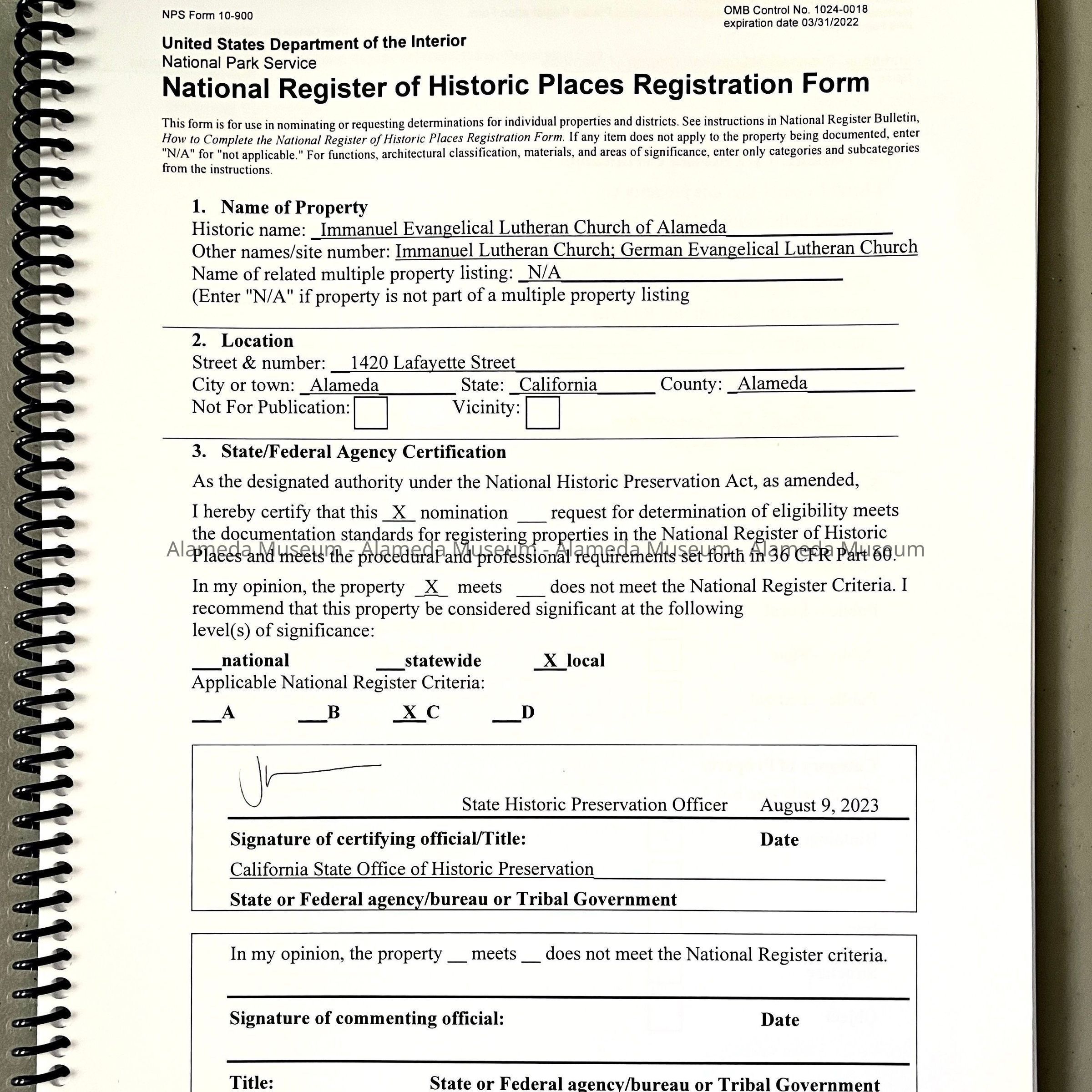 Description: booklet bound with plastic spiral, titled: ‘National Register of Historic Places Registration Form‘, Name of Property: Immanuel Evangelical Lutheran Church of Alameda. Includes history description and photos. Front cover is clear flexible plastic, back cover flexible navy blue plastic.
