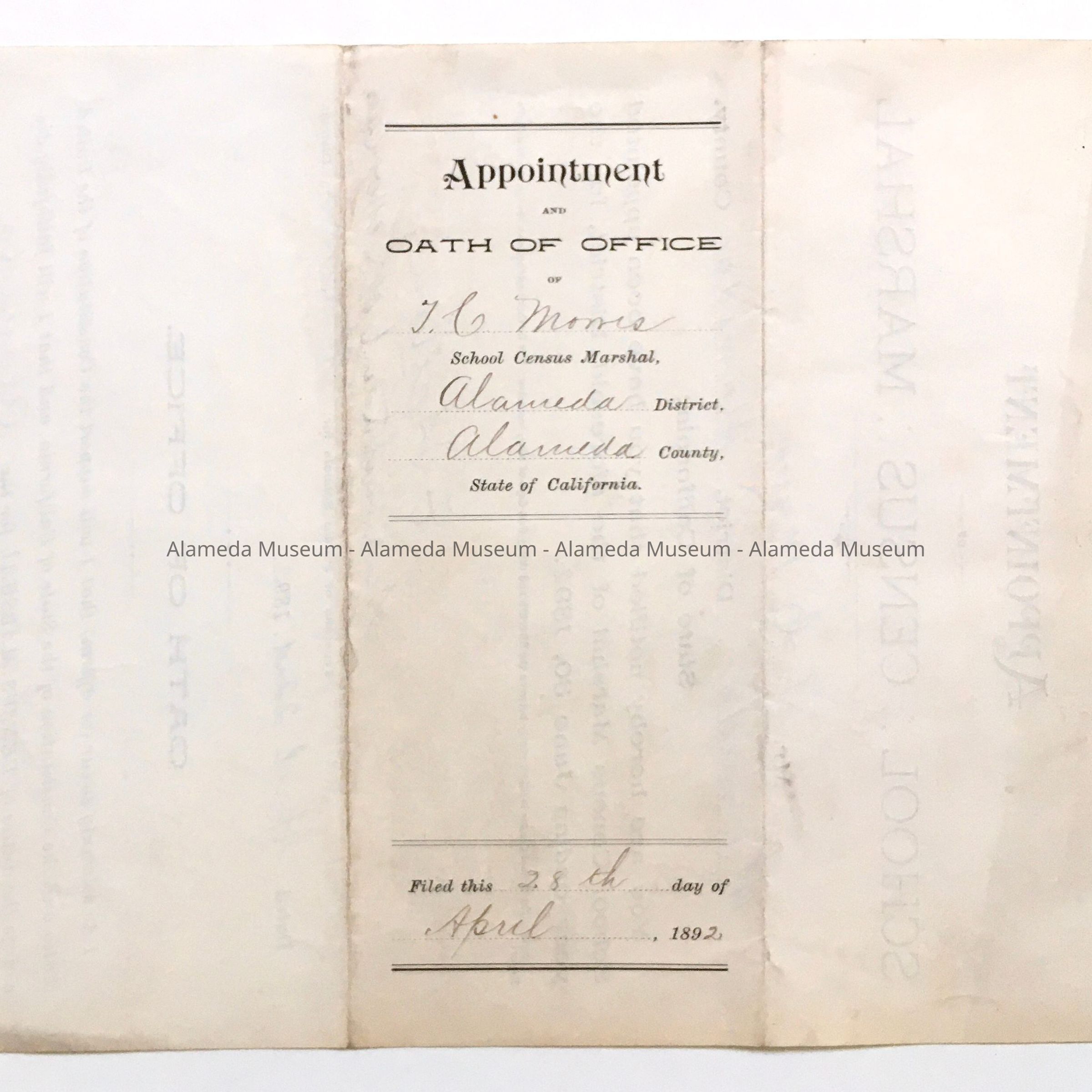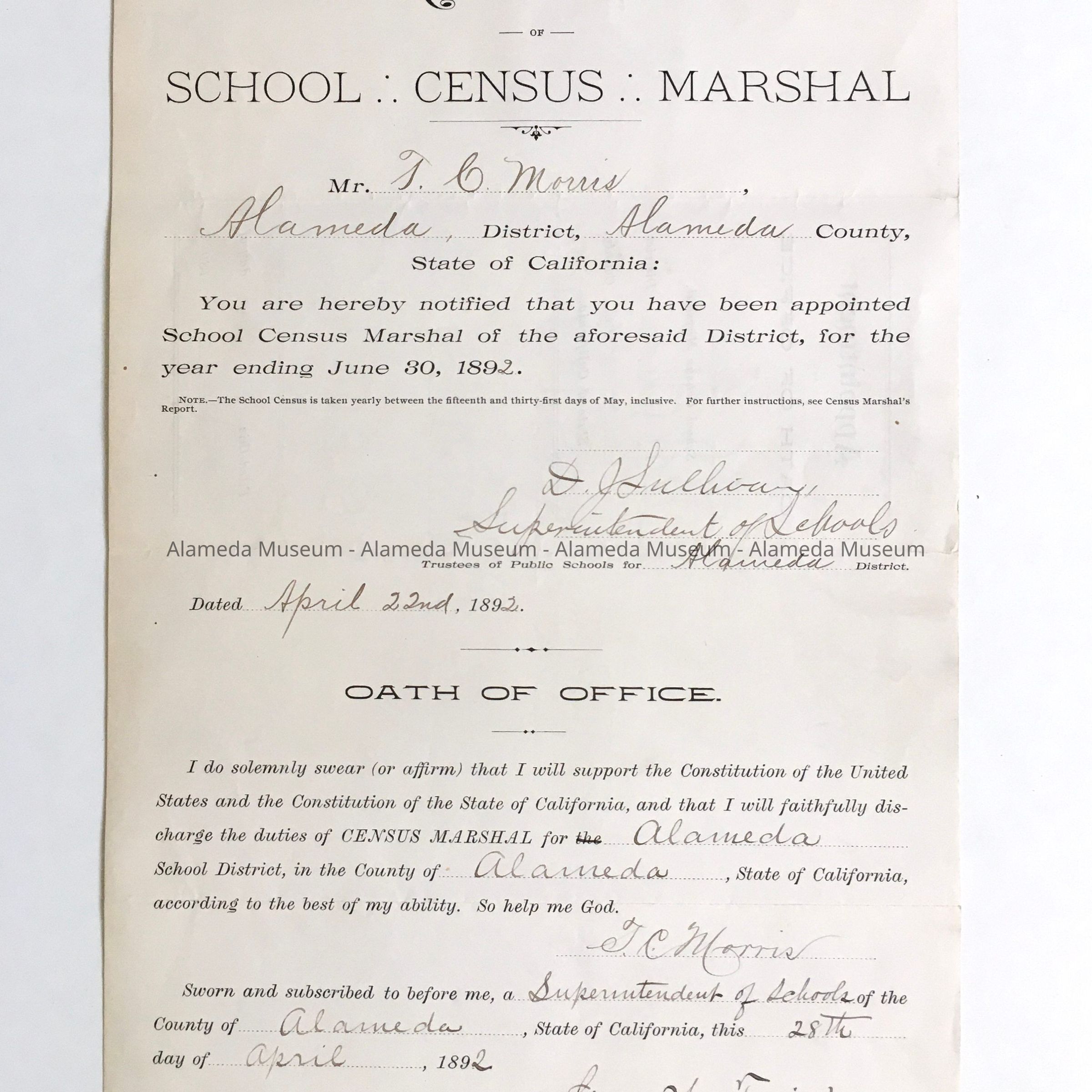 HISTORY OF OBJECT: APPOINTMENT FORM AUTHORIZING T C MORRIS TO BE THE CENSUS MARSHAL FOR THE CITY OF ALAMEDA. FORM WAS DATED APRIL 28, 1892 AND SIGNED BY DJ SULLIVAN, SUPERINTENDENT OF SCHOOLS, ALAMEDA, AND GEORGE W FRICK, SUPERINTENDENT OF SCHOOLS, ALAMEDA COUNTY, CA.