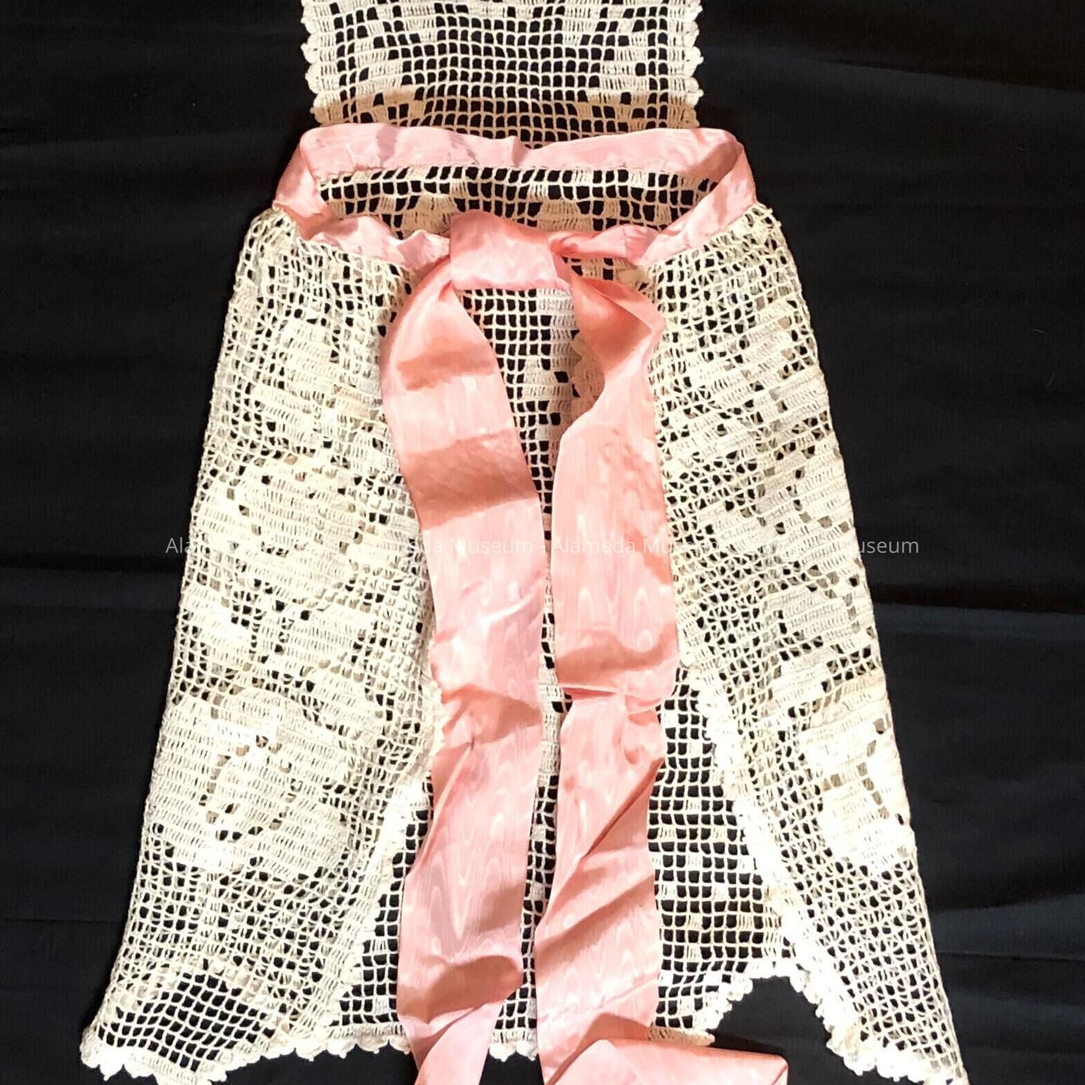 Apron with white hand-crocheted design with floral motif and pink ribbon, before 1998Entry/Object ID