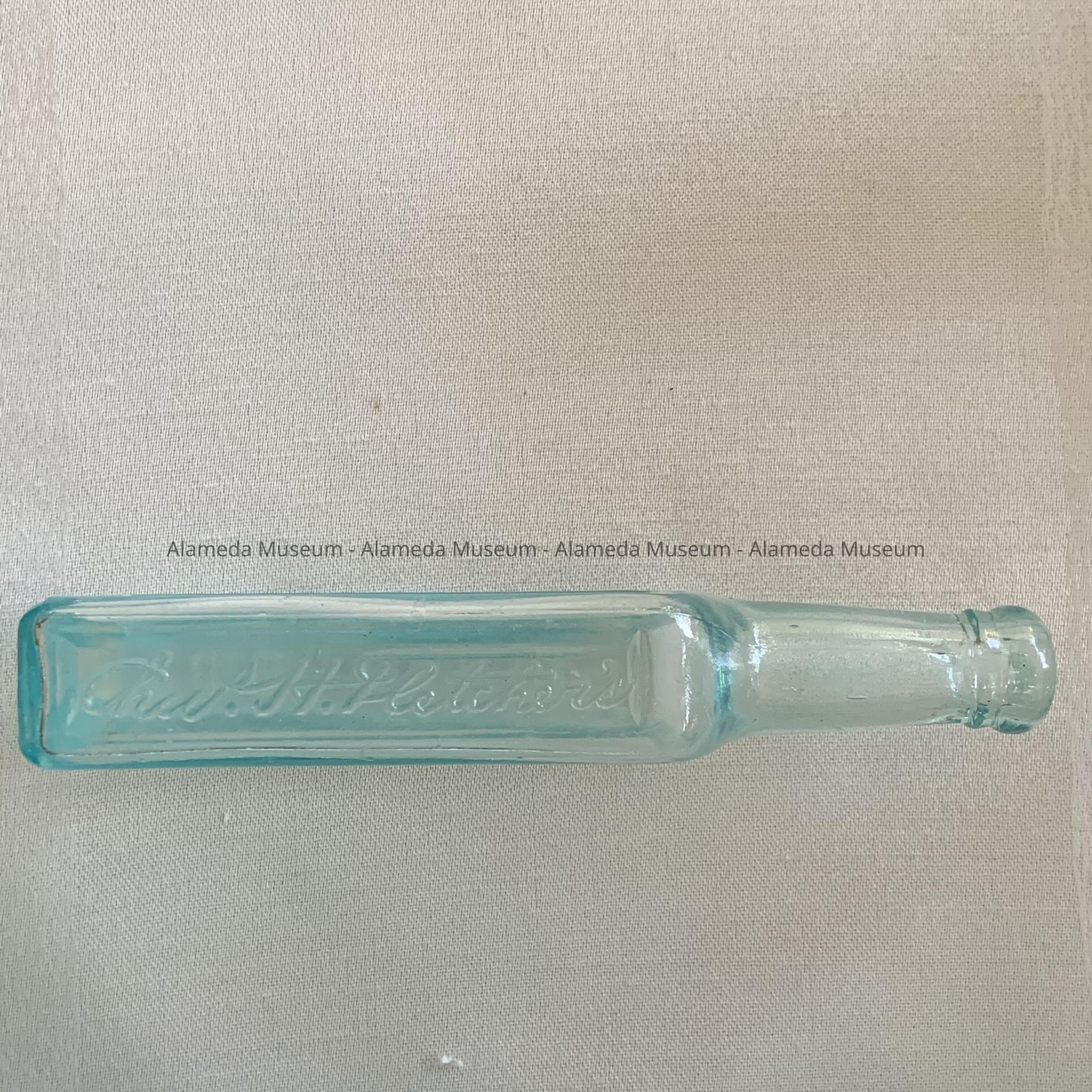 MEDICINAL BOTTLE, FLAT-SIDED. DOUBLE SEAM, AQUA-COLORED GLASS. FLAT-SIDE OF BOTTLE BEARS EMBOSSED WORD, "CASTORIA". THE OPPOSITE FLAT SIDE READS, "CHARLES H FLETCHER'S."