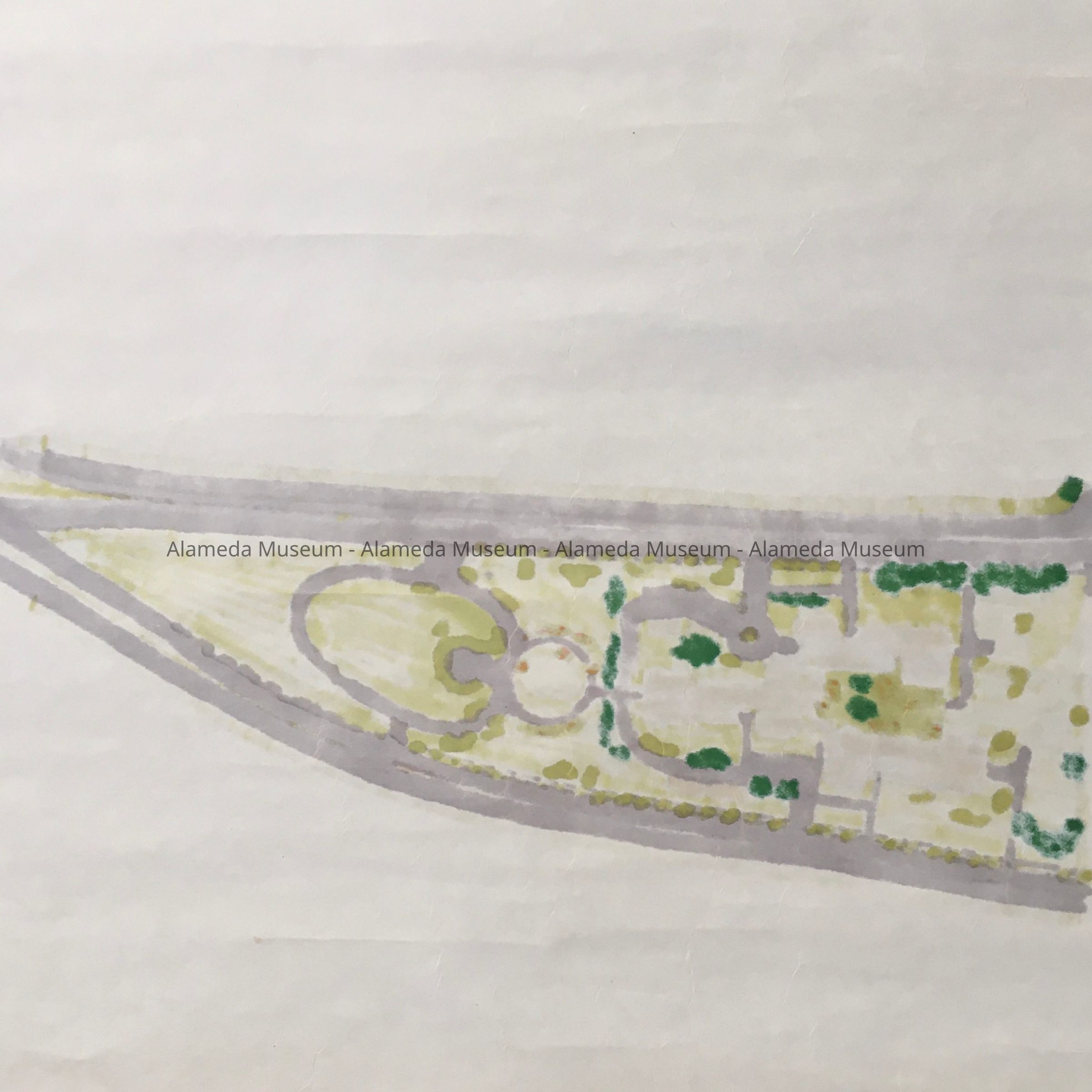 DESCRIPTION: AN ARCHITECTURAL DRAWING WHICH APPEARS TO BE HAND-COLORED. THE DRAWING HAS A BOLD-PRINTED CAPTION, "ALAMEDA SENIOR CITIZEN HOUSING."