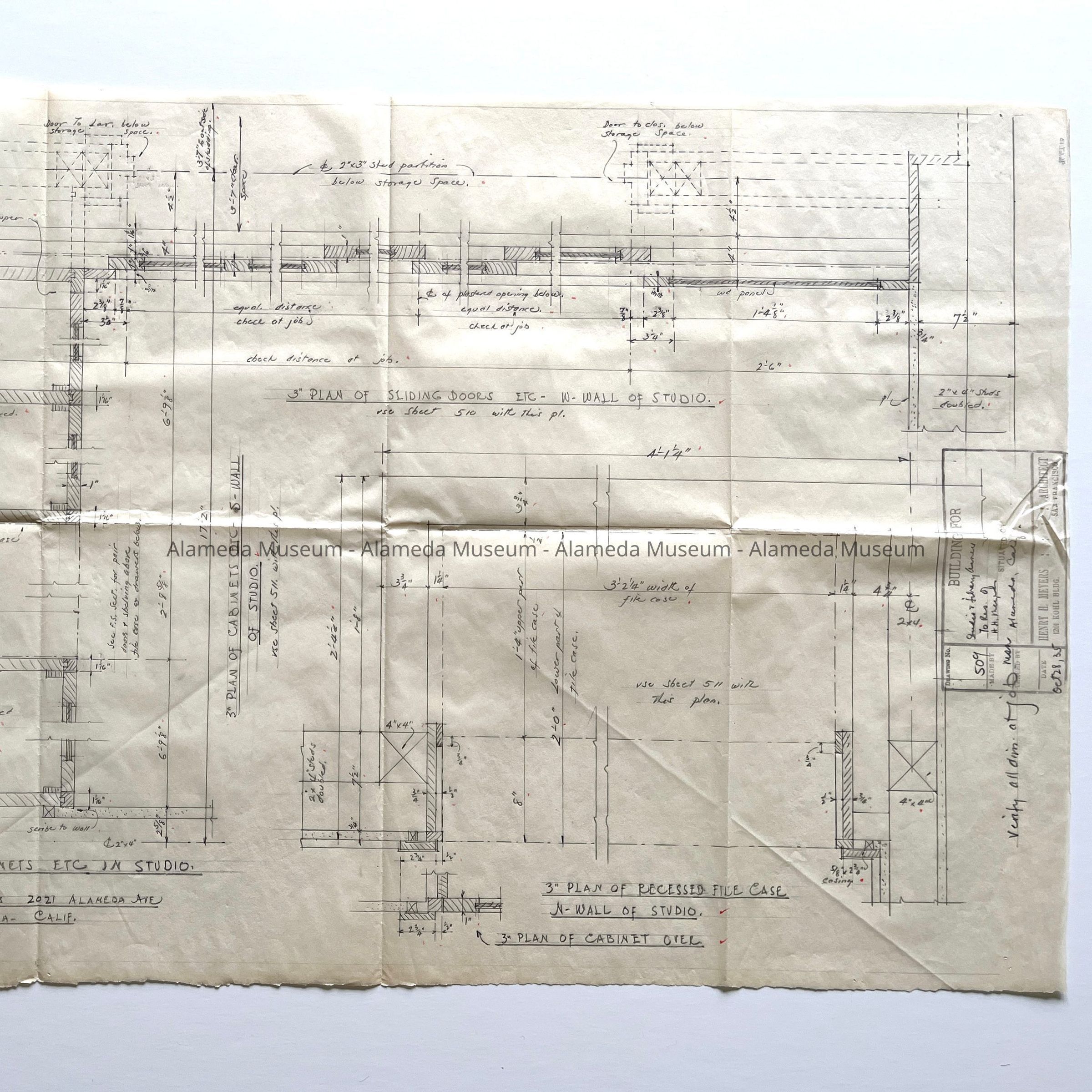 PLANS OF CABINETS, ETC., SOUTH WALL OF STUDIO AND LIBRARY ANNEX TO THE RESIDENCE OF HENRY H MEYERS, ARCHITECT, PLANS DRAWN BY DAUGHTER --- MILDRED S MEYERS, ALSO AN ARCHITECT --- ON OCTOBER 28, 1935. THE MEYERS' RESIDENCE IS LOCATED AT 2021 ALAMEDA AVENUE IN ALAMEDA, CALIFORNIA.