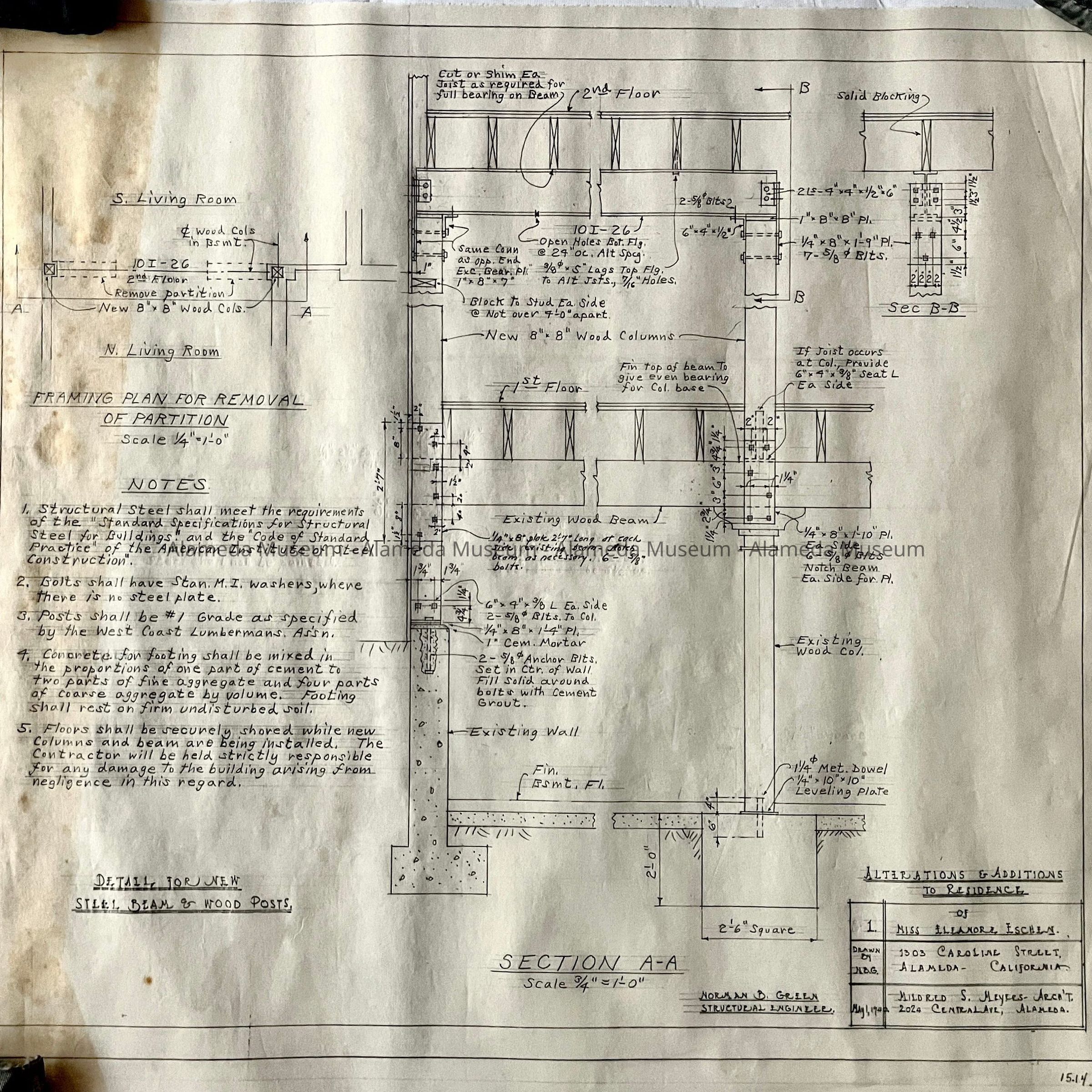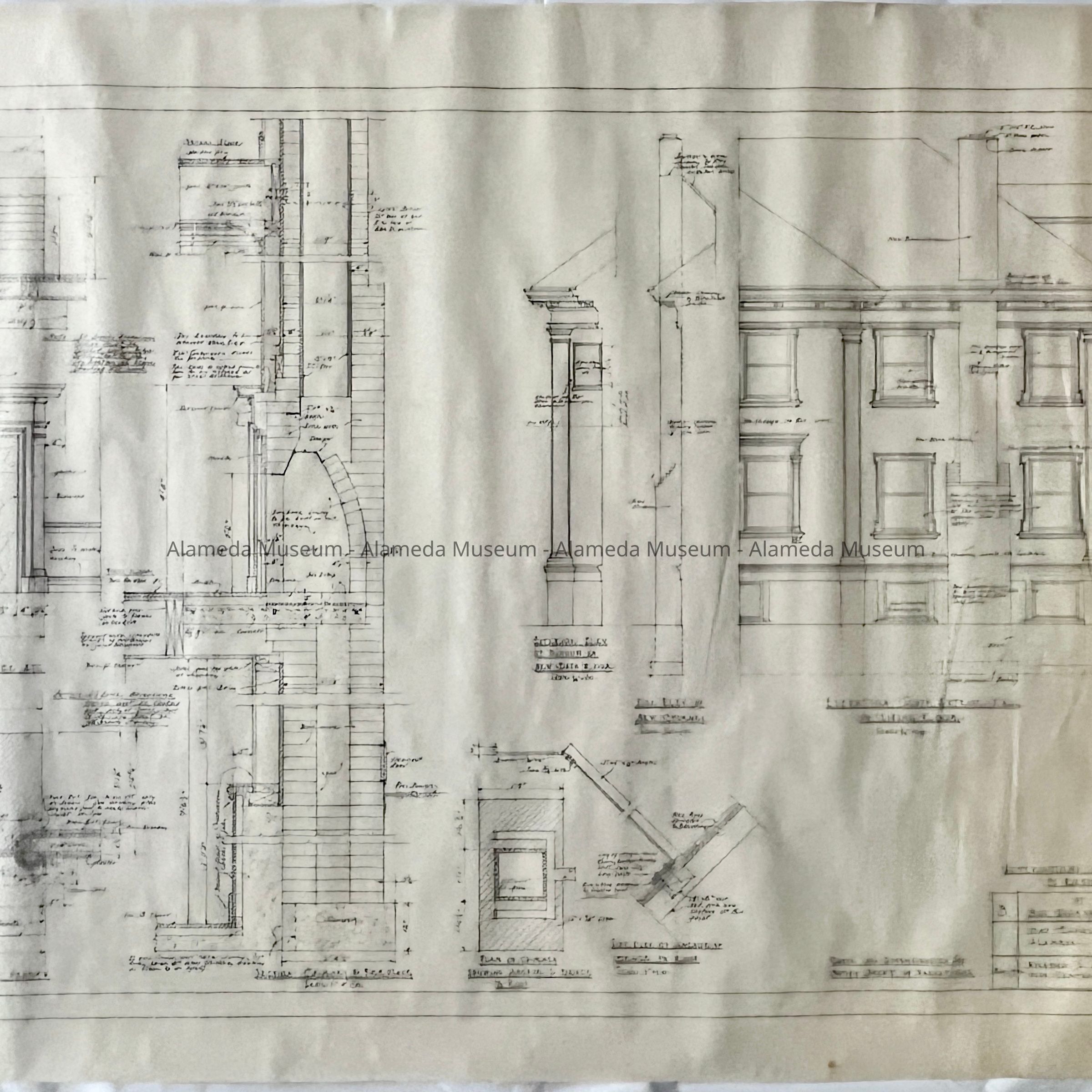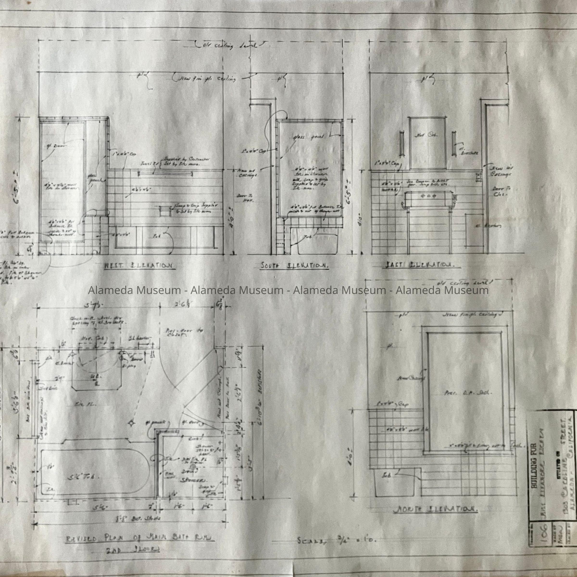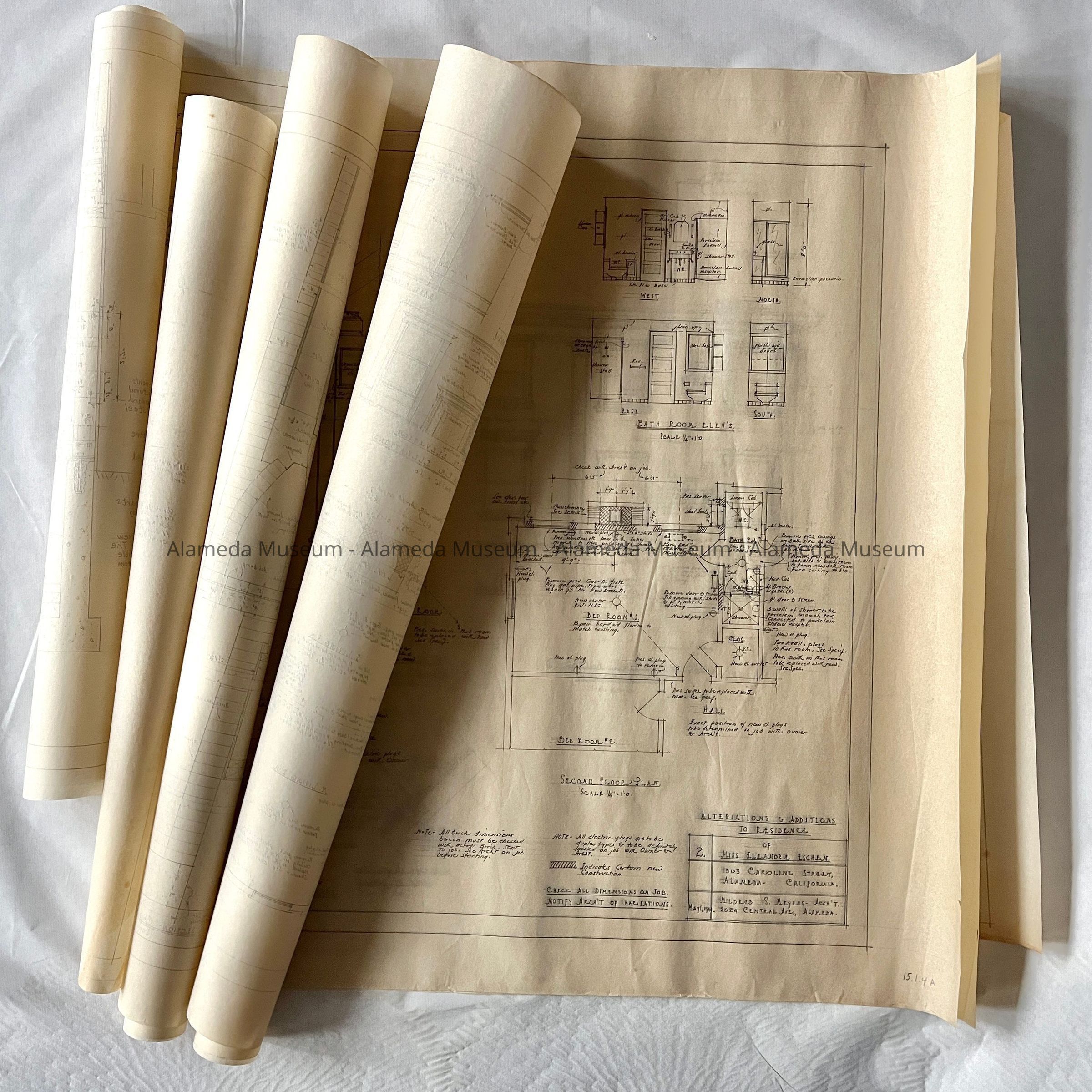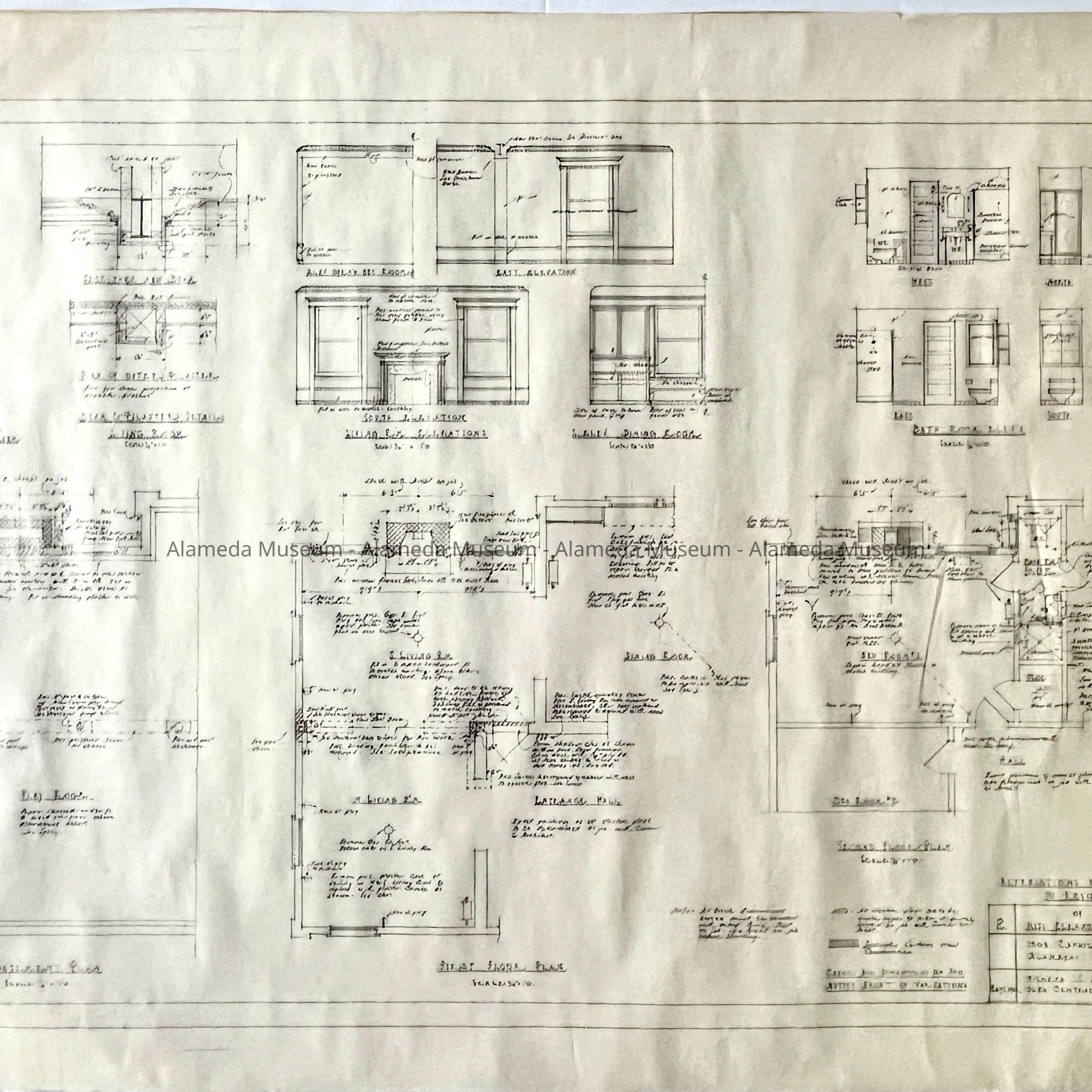 DESCRIPTION: ARCHITECTURAL DRAWINGS ON TISSUE PAPER AND WRITTEN IN PENCIL. ALTERATION DRAWINGS AND ADDITIONS AT THE RESIDENCE OF MS. ELEANOR ESCHEN, 1303 CAROLINE STREET, ALAMEDA, SIGNED BY MILDRED MEYERS, ARCHITECT.