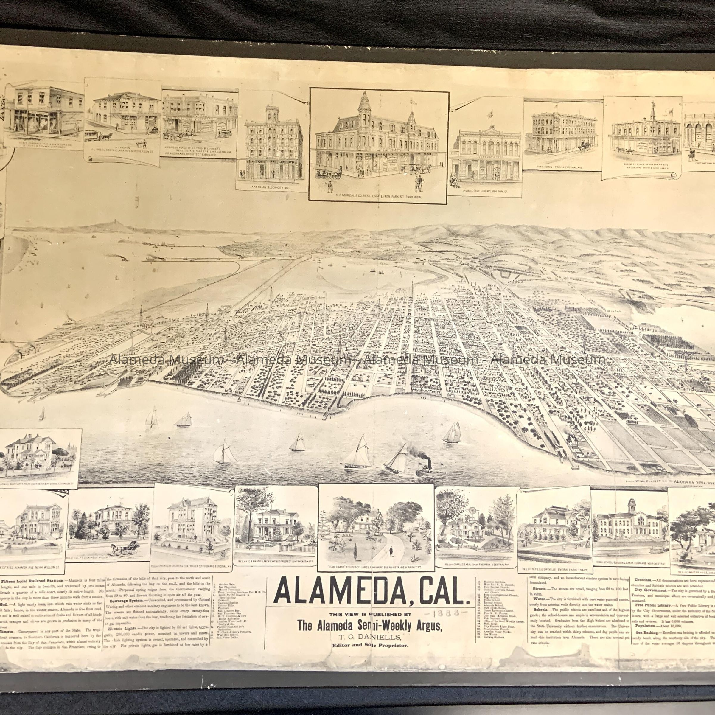 REPRODUCTION OF A BIRD'S-EYE VIEW OF ALAMEDA, PUBLISHED IN THE ALAMEDA SEMI-WEEKLY "ARGUS." T G DANIELLS, EDITOR AND PUBLISHER. A HANDWRITTEN CAPTION ON THE REVERSE SIDE OF THE MAP STATES, "REPRODUCED FROM AN ORIGINAL IN POSSESSION OF F I CROLL, CITY OF ALAMEDA AUDITOR AND ASSESSOR, CALIFORNIA'S CENTENNIAL YEARS, 1948-49-50." IT ALSO STATES THAT IT IS THE PROPERTY OF JOHN H HARDER FAMILY, 338 HAIGHT AVENUE, ALAMEDA.