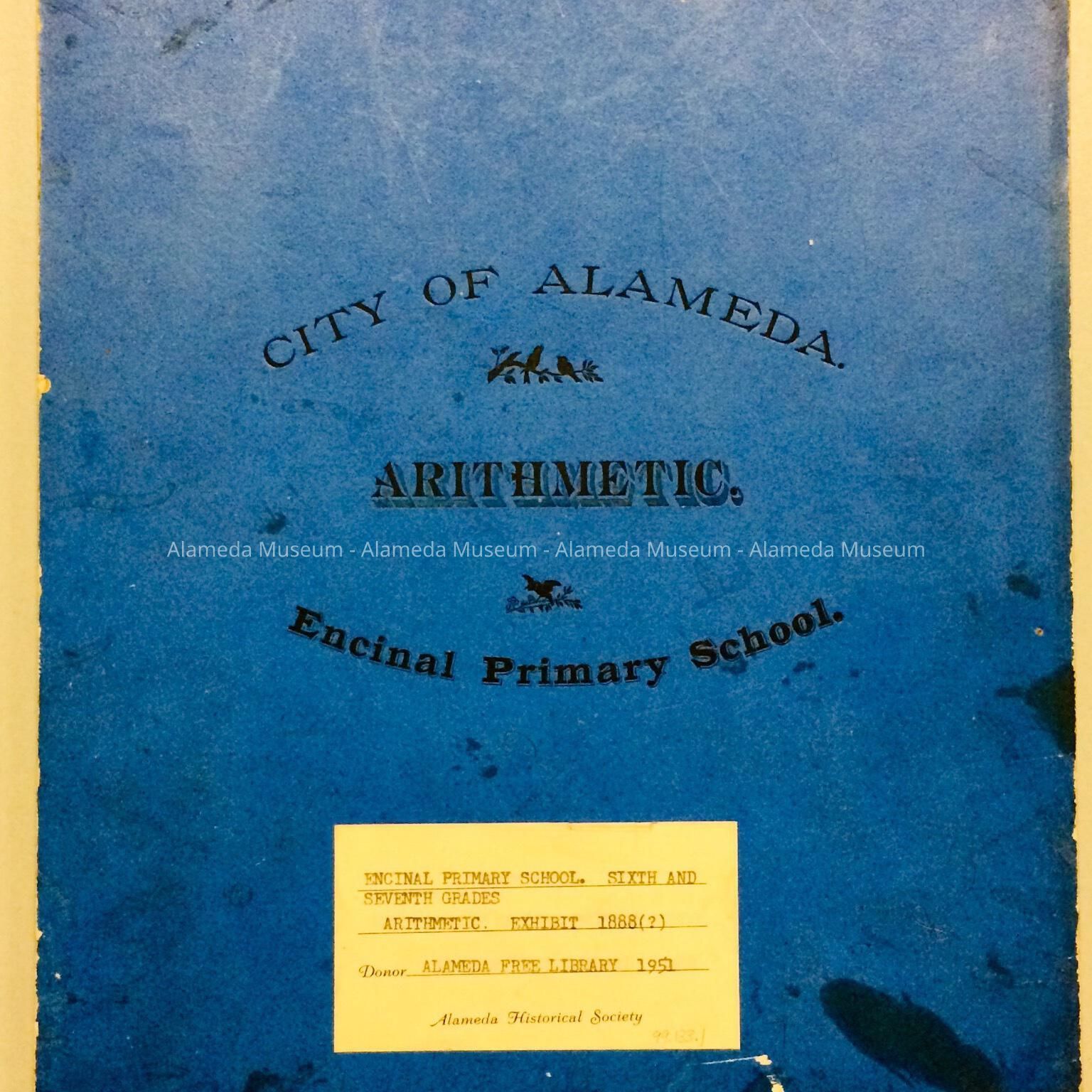 Description: Loose leaf booklet with cover of blue colored cardboard. Cover has caption, "City of Alameda - Arithmetic Encinal Primary School" in black colored type.