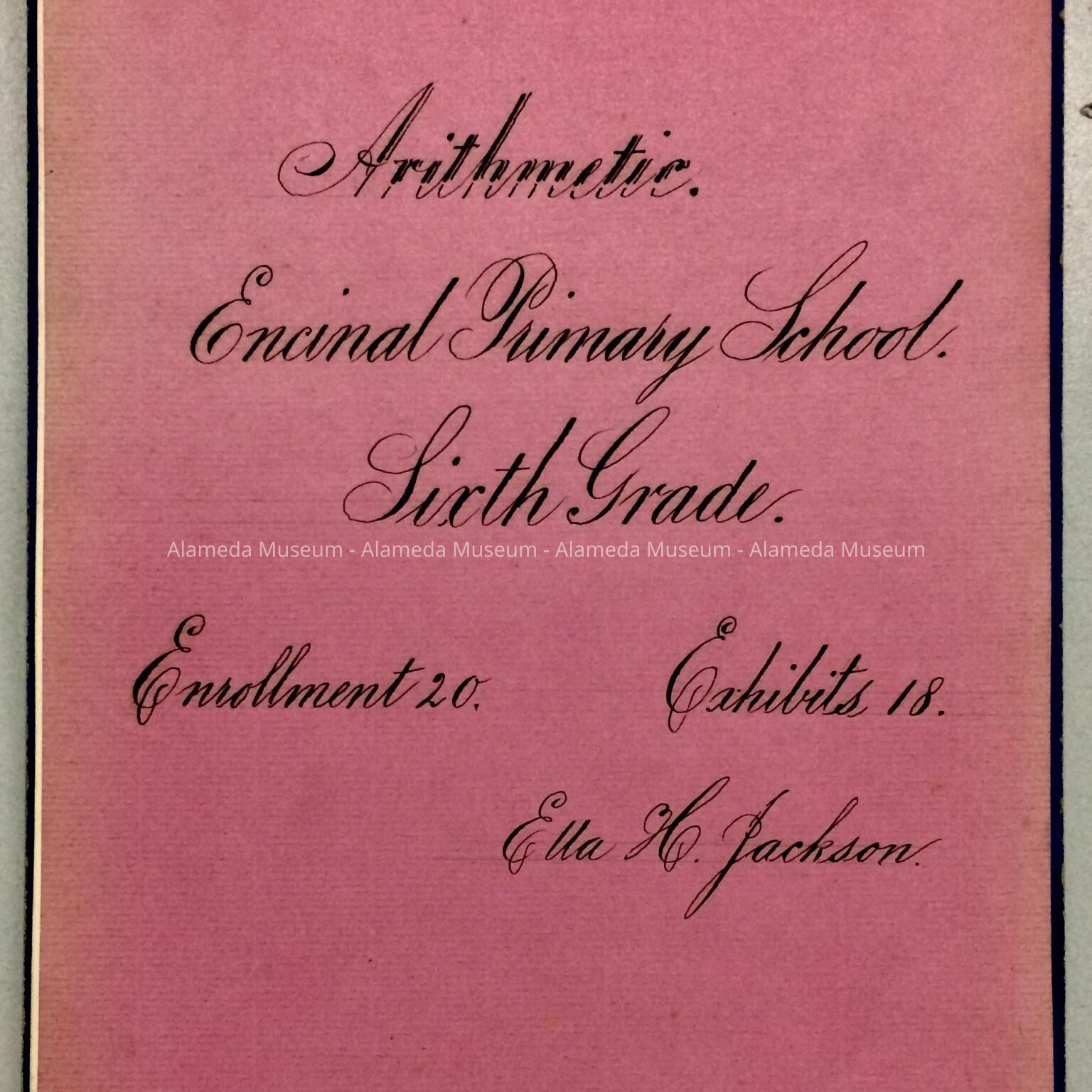 History: Exhibition folder containing arithmetic work of Sixth and Seventh grades of Encinal Primary School. The name was changed to Mastick. Exhibits are done in ink on lined paper.