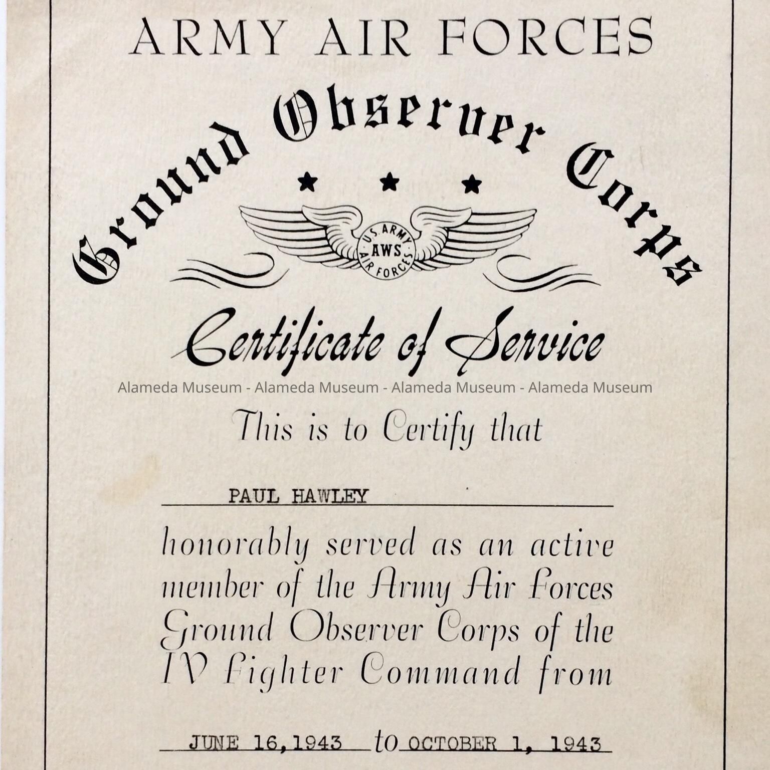 Certificate of Service awarded to Paul Hawley as a member of the Ground Observer Corps. from June through October 1943.