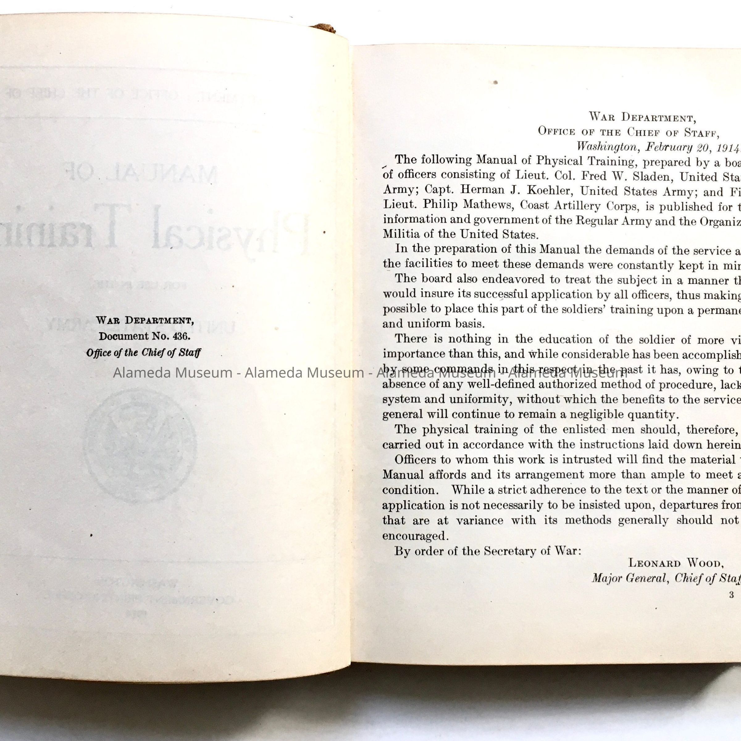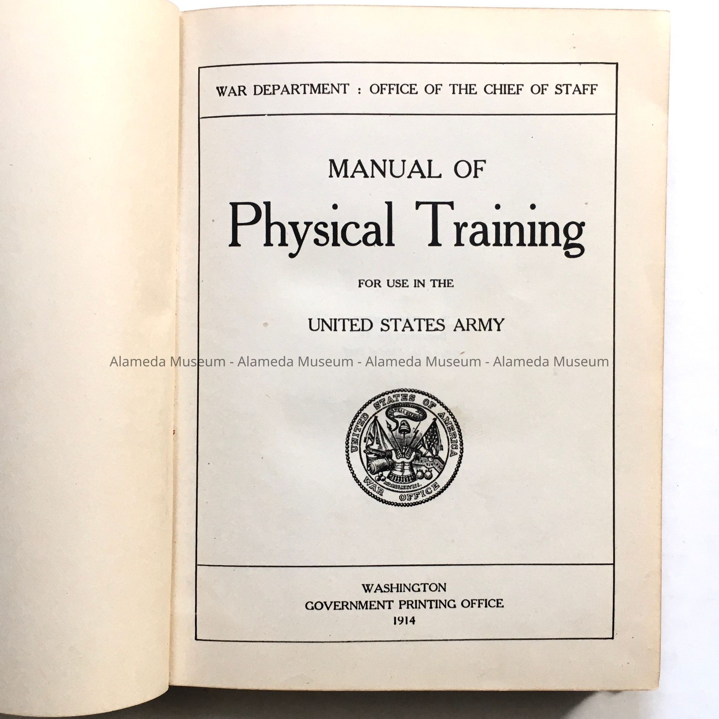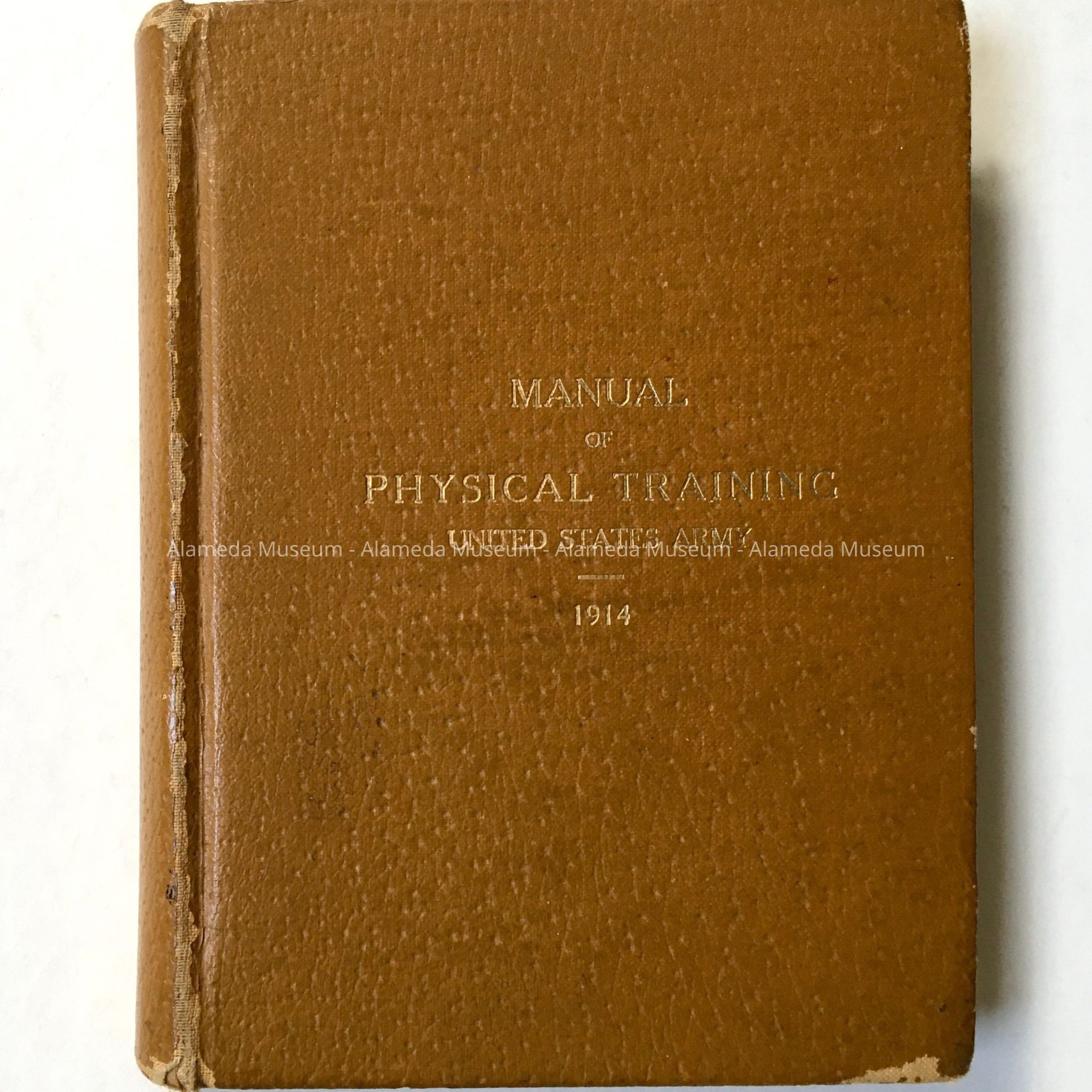 Description: Book with title stamped in gold on front of deep tan-colored imitation leather cover: "Manual of Physical Training, United States Army, 1914." Inside of front cover is handwritten : Otto Rittler, Alameda High School, Alameda, Cal. and stamped Otto Rittler on second fly sheet. Title page states: War Department, Office of the Chief of Staff Manual of Physical Training for use in the United States Army, Washington, Government Printing Office, 1914. 335 pages, illustrated with black and white photographs and line drawings.