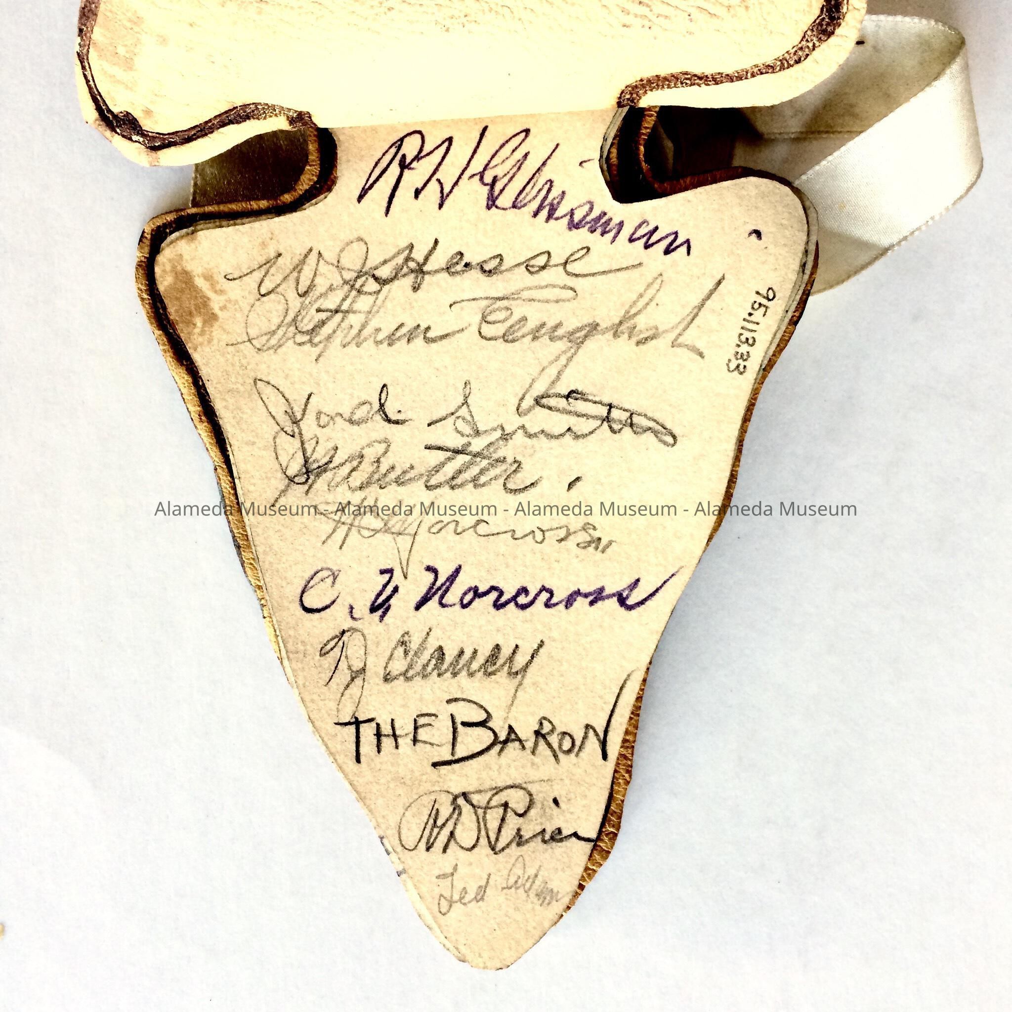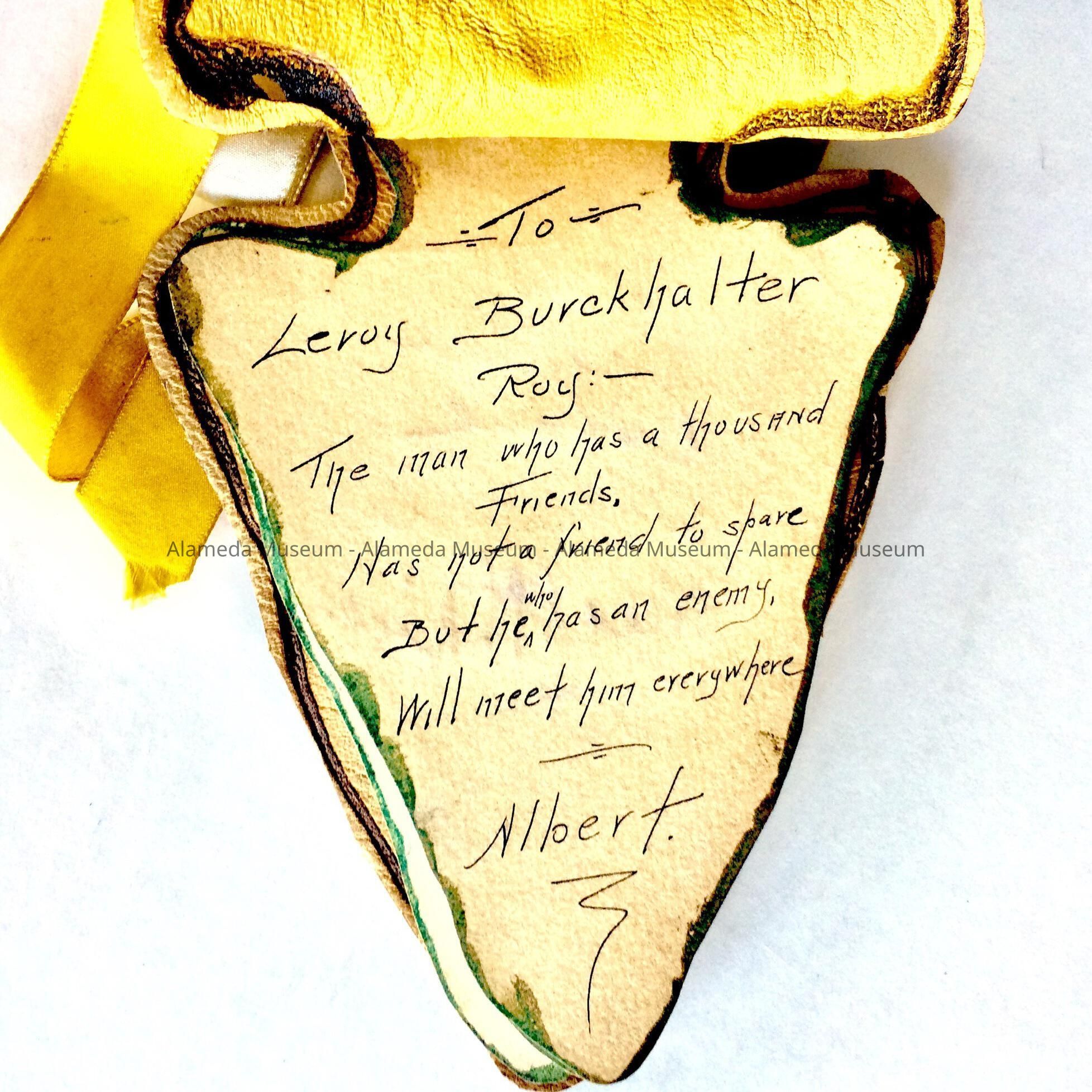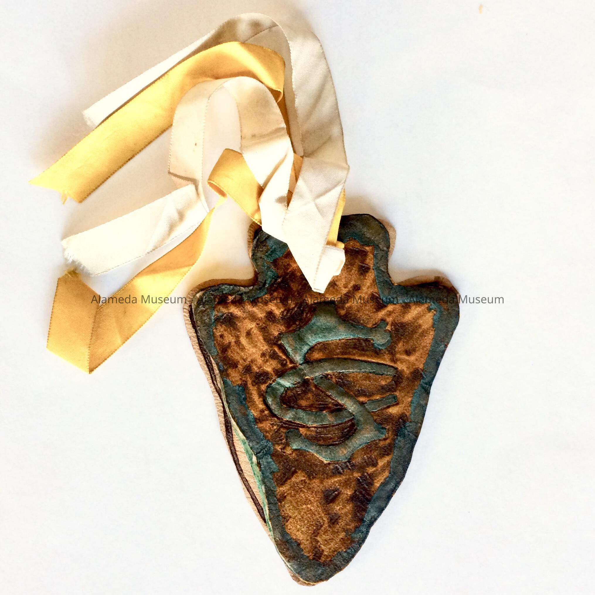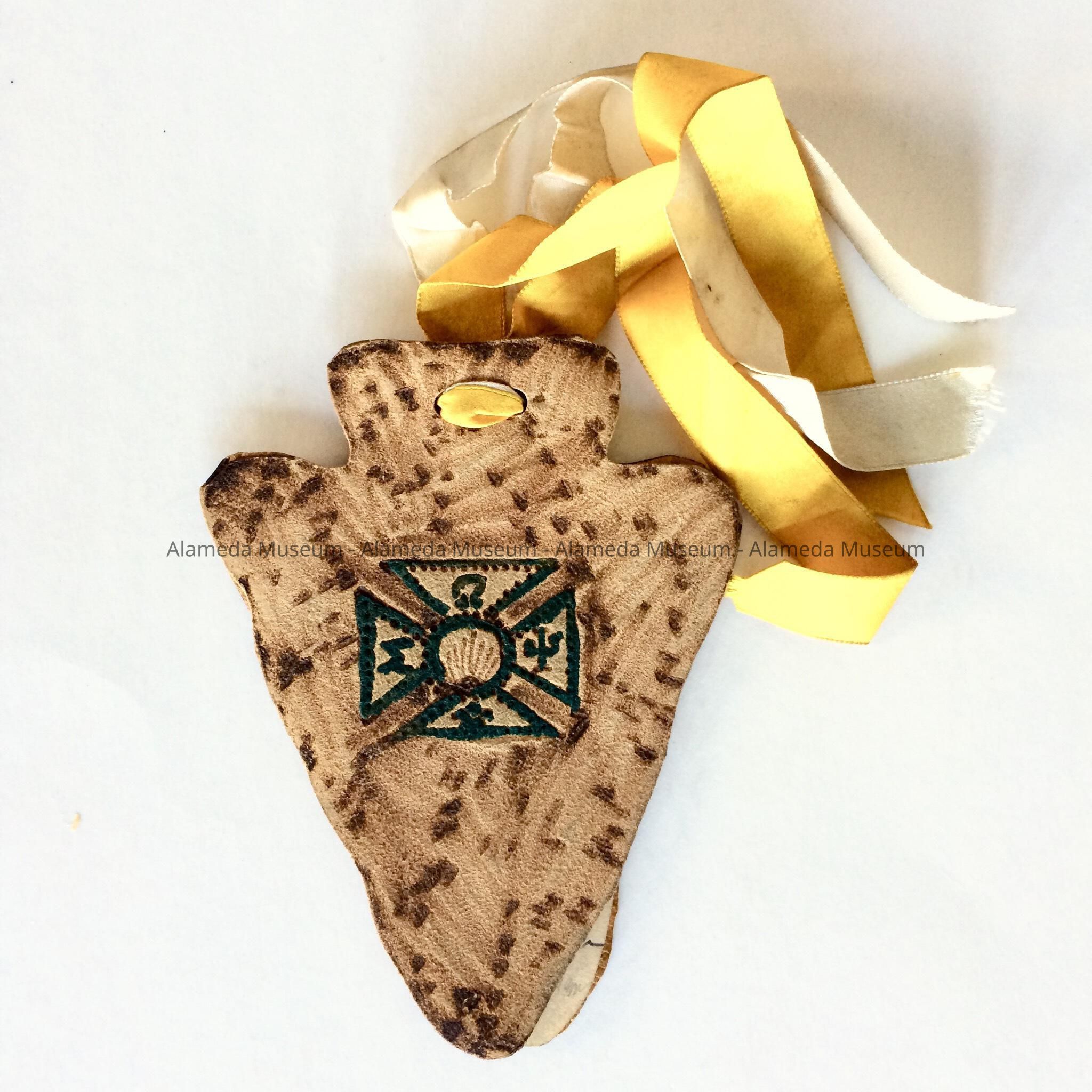 UNUSUAL INVITATION, SHAPED LIKE AN INDIAN ARROWHEAD, WITH COVER OF TOOLED LEATHER. INTERIOR CONTAINS PAGES WITH HAND-INSCRIBED MESSAGES IN INK. WHITE AND GOLD SILK RIBBON TIE SERVES AS THE BINDING.