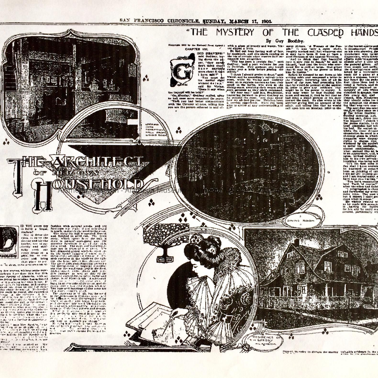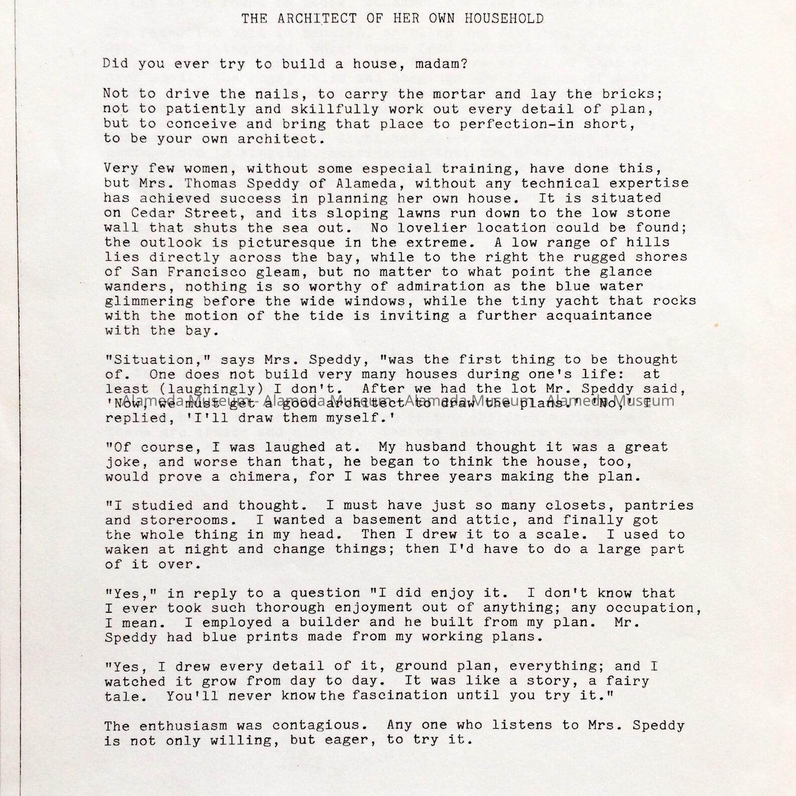 AN ARTICLE THAT APPEARED IN THE SAN FRANCISCO CHRONICLE NEWSPAPER, MARCH 17, 1901. CONTENTS CONCERNED THE HOME OF MRS THOMAS S SPEDDY, WHICH SHE DESIGNED, AT 855 CEDAR STREET, ALAMEDA. THE STRUCTURE STILL STANDS.